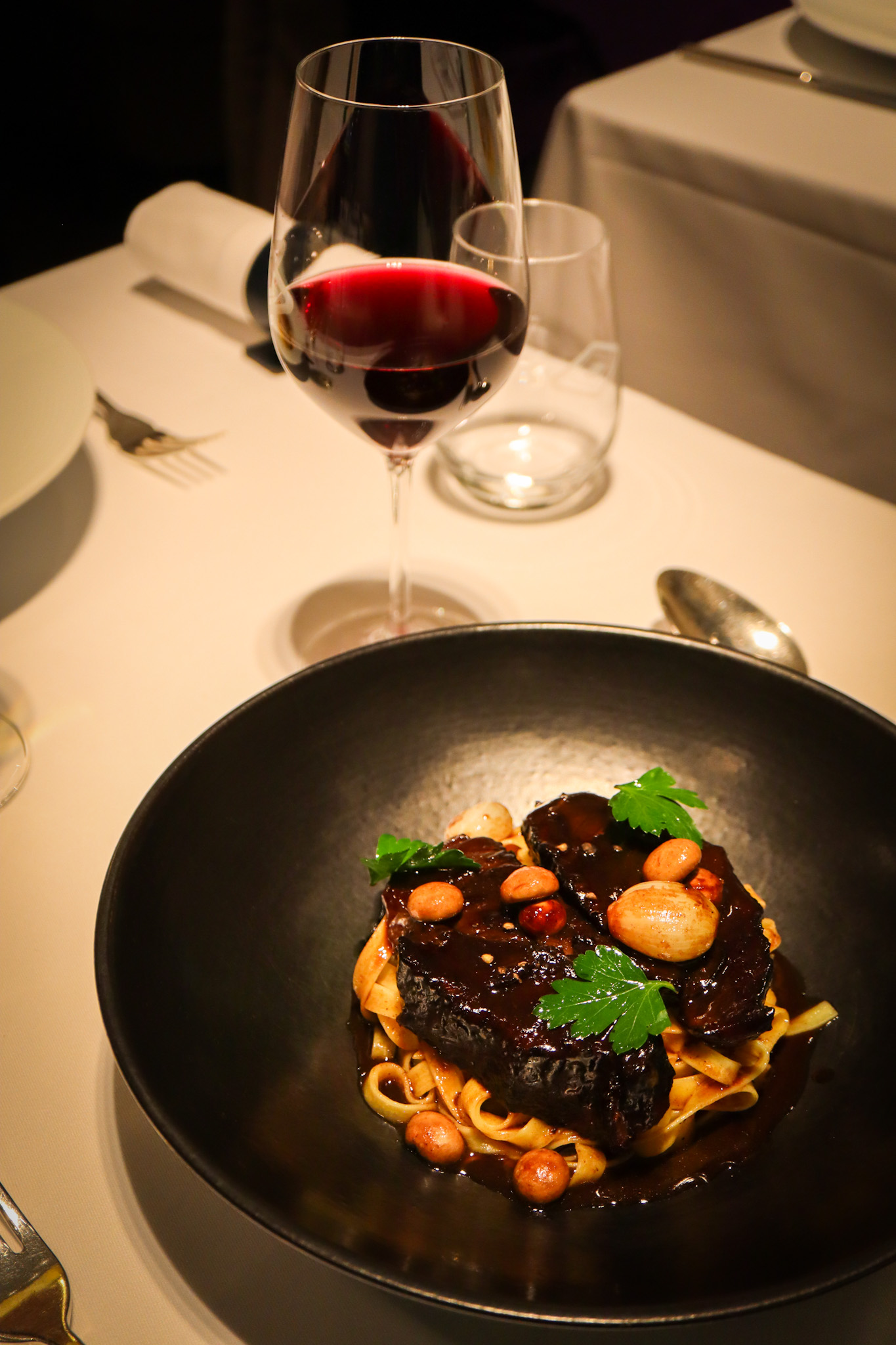 On fait alors la connaissance du chef Sommelier Cédric Pouzet qui nous suggère sur cet accords mets et vins avisé, un ravissant chenin Clos de Beauce 2020 et le magnifique bourgogne cuvée E.J Thevenet du Domaine de la Bongran. Saisissant, le raffiné sandre sauvage cuit sur peau, fondue de poireaux et beurre nantais s’épanouit délicatement en bouche avec l’exquis Saint-Peray Harmonie d’Alain Voge. On sait que le plat qui sort, dans la foulée, des cuisines est l’un des immanquables du Violon d’Ingres : la fameuse noix de joue de bœuf braisée et tagliatelles artisanales. On savoure à cet instant l’esprit convivial néobrasserie des lieux où l’on échange sur le Sud-Ouest, son rugby et les petites propriétés du Lot-et-Garonne.