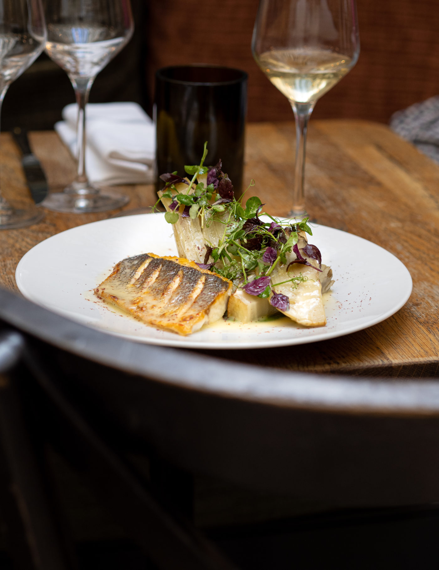 Sur cette lancée, une nouvelle page – la formule du jour à 26 euros – placée sous le signe du rafraichissement (en été, du moins) s’ouvre sur une assiette de tomates du jardin. Ces rares tomates ayant préservé leur saveur d’antan (ou presque) s’accompagnent de l’inévitable basilic, d’un délicieux pesto maison et de sa majesté l’huile d’olive, reine des assiettes estivales. Nul besoin de sophistication, de bonnes tomates ainsi qu’un bon assaisonnement suffisent à renvoyer le client nostalgique au potager de son enfance.