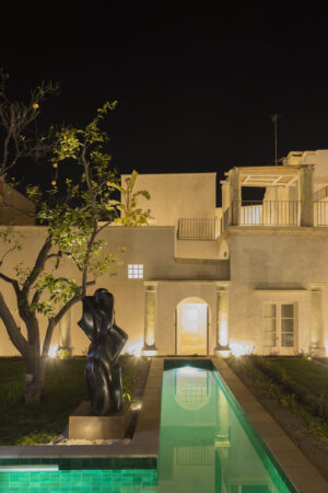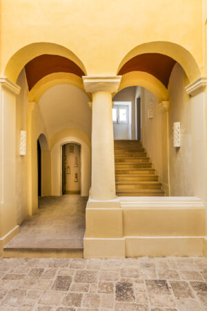 Installé au cœur de deux palais historiques du XVIIIe siècles qui ont été entièrement rénovés, le Palazzo Maritati e Muci a été transformé en maison d’hôtes et décoré dans un esprit contemporain qui respecte ses formes architecturales d’origine. Trois années de travail ont permis de raviver la splendeur de ses deux palais dont les fresques, les tableaux, les voûtes en étoile et les couleurs témoignent d’un riche passé. Entre la rénovation confiée à une équipe mixte d’architectes locaux et internationaux et la décoration intérieure, orchestrée par Jérôme Faillant Dumas, ex-directeur artistique d’Yves Saint-Laurent et de Dior, et par Katherina Marx, productrice de documentaires télévisés et épouse de Guy Martin, le résultat est d’une élégance simple et d’un raffinement extrême.