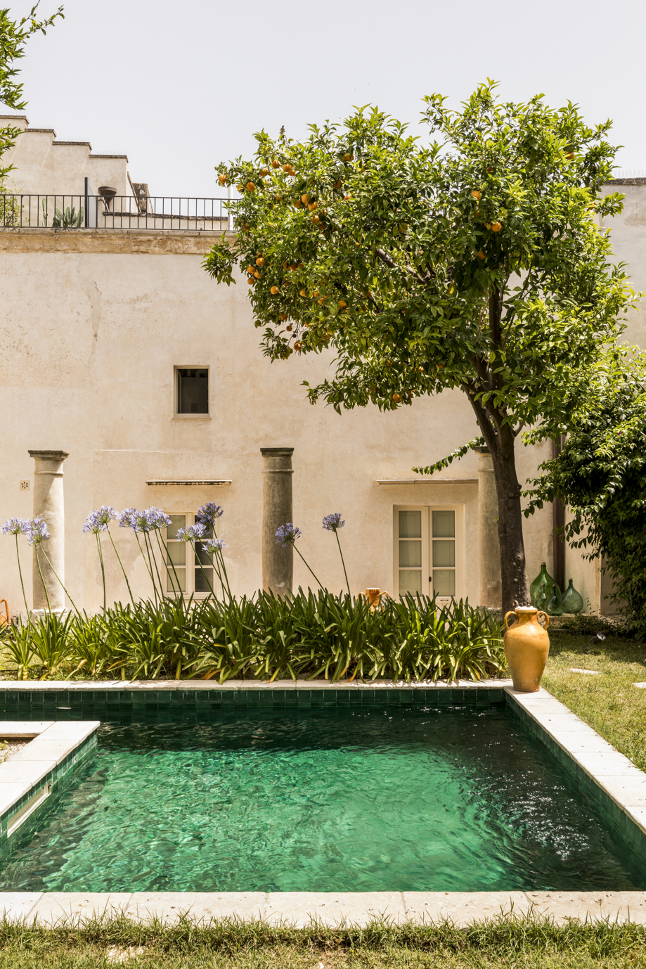 Véritable havre de paix, la terrasse sur plusieurs niveaux du Palazzo Maritati se transforme en oasis sous le ciel bleu profond du Salento tandis que la piscine du Palazzo Muci s’ouvre sur un jardin accueillant à l’herbe moelleuse.