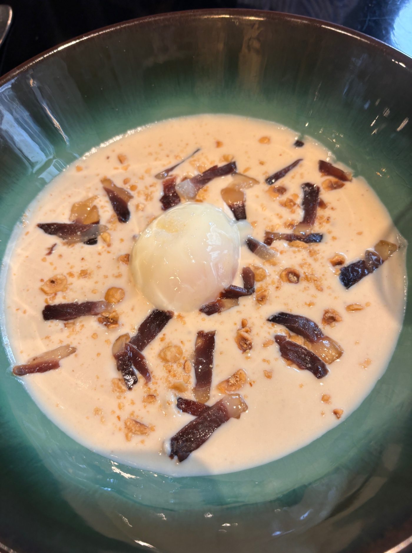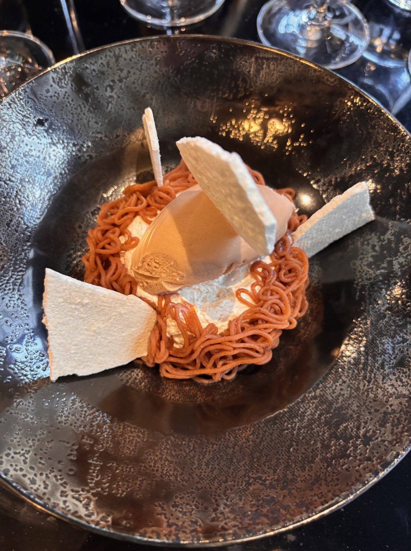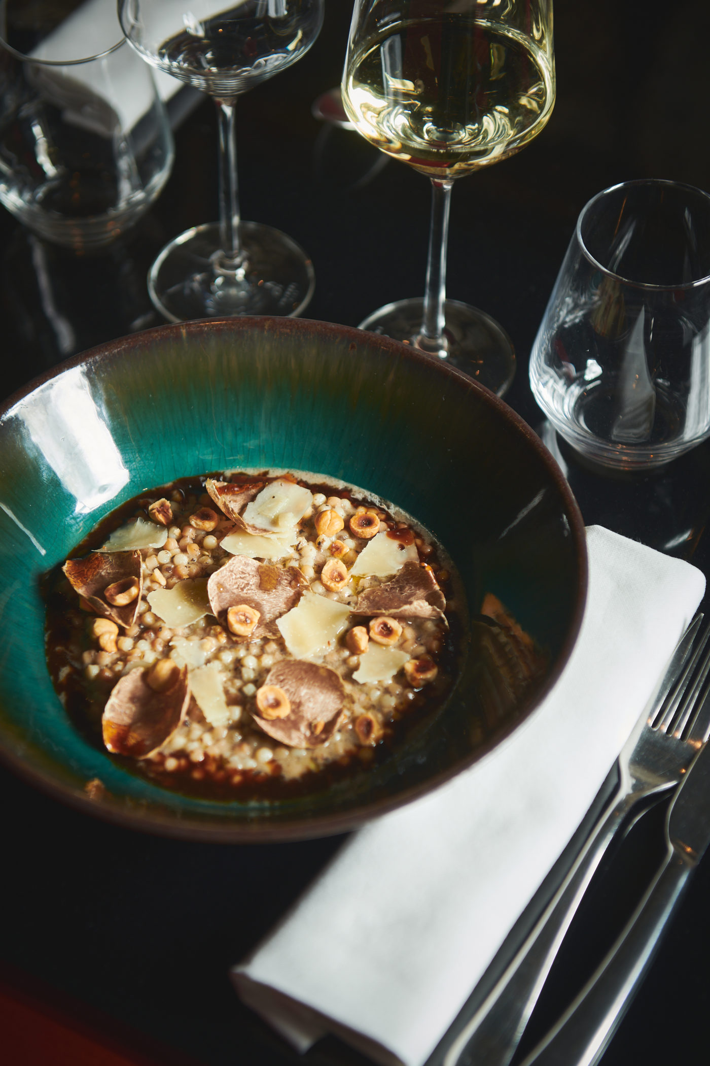 Coté vins, les entrées ont été accompagnées par le fabuleux Crozes-Hermitage 100% syrah de Laurent Combier et un Magallana de la Maison Lafon. Ce blanc attachant, tout en fraicheur, fait voir un magnifique terroir en grès au sommet d’une colline. Les vins proposés au verre sont tous servis ici en magnum. Tout ce que l’on aime. On arrive sur la partition des plats avec un choix sacrificiel en tête. Viande ou poisson ? Le skrei fumé, émulsion brandade, topinambour et ciboulette aurait été la promesse d’un moment de grande émotion mais on ira finalement sur la ravissante pintade farcie sarriette et duxelle, pomme darphin et pousses d’épinards. Le dressage minimale et téméraire nous plonge illico dans l’imagination du chef intrépide.