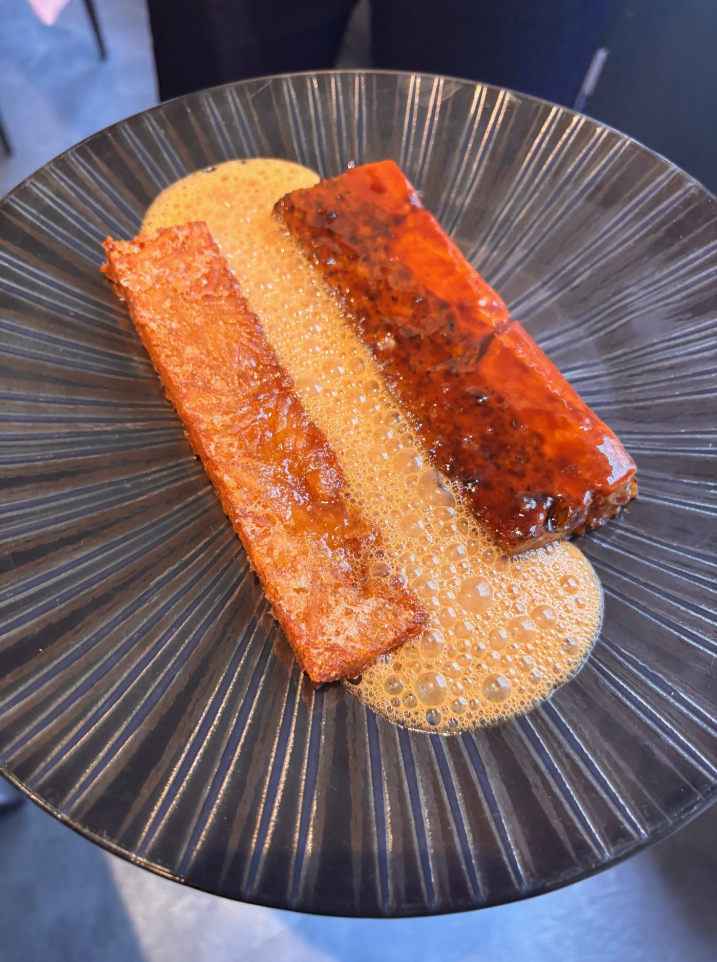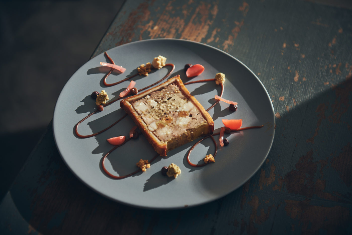 On a quartier libre et on est là pour vivre l’expérience au plus juste et au plus près. Kadidja qui est en charge de la partition sommelière, porte -voix des caves et des fourneaux, nous suggère judicieusement d’avancer sur une sélection des plus beaux plats. Elle nous guidera. On décide donc de tester les trois entrées en mode partage. Le velouté de céleri, oeuf 64°, magret, noisette comté, mouillette truffée envoie du lourd. C’est déroutant et percutant. Le pâté-croûte « signature », artichaut , foie gras, truffe et volailles époustoufle et désarçonne. On aime les condiments de porto et de moutarde de Brive. C’est bien vu ! Quant à elle, la version du chef du Fish&Chips, tartare miso yuzu et sésame noir est délicieusement épatant.