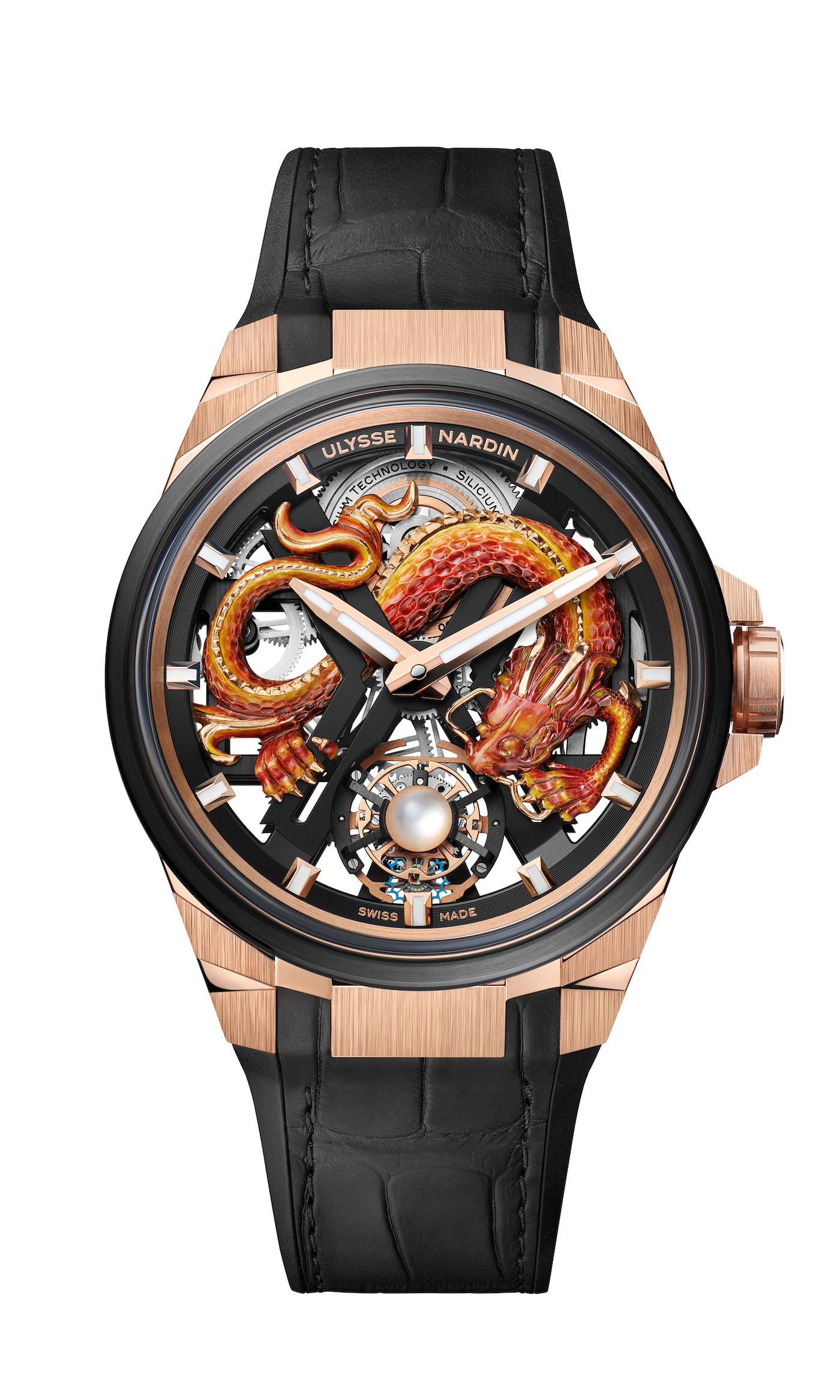 La Spirit of Big Bang Titanium Dragon de Hublot superpose ses aiguilles, ses roues et ses vis en H pour dessiner la silhouette d’un fantastique dragon en 3 D, à l’instar de la technique ancestrale du papier découpé. Chez Ulysse Nardin, un dragon en or rose posé sur le cadran squeletté de la Blast semble surgir du cœur du mouvement, prêt à saisir la perle convoitée qui trône au sommet de la cage du tourbillon volant.
