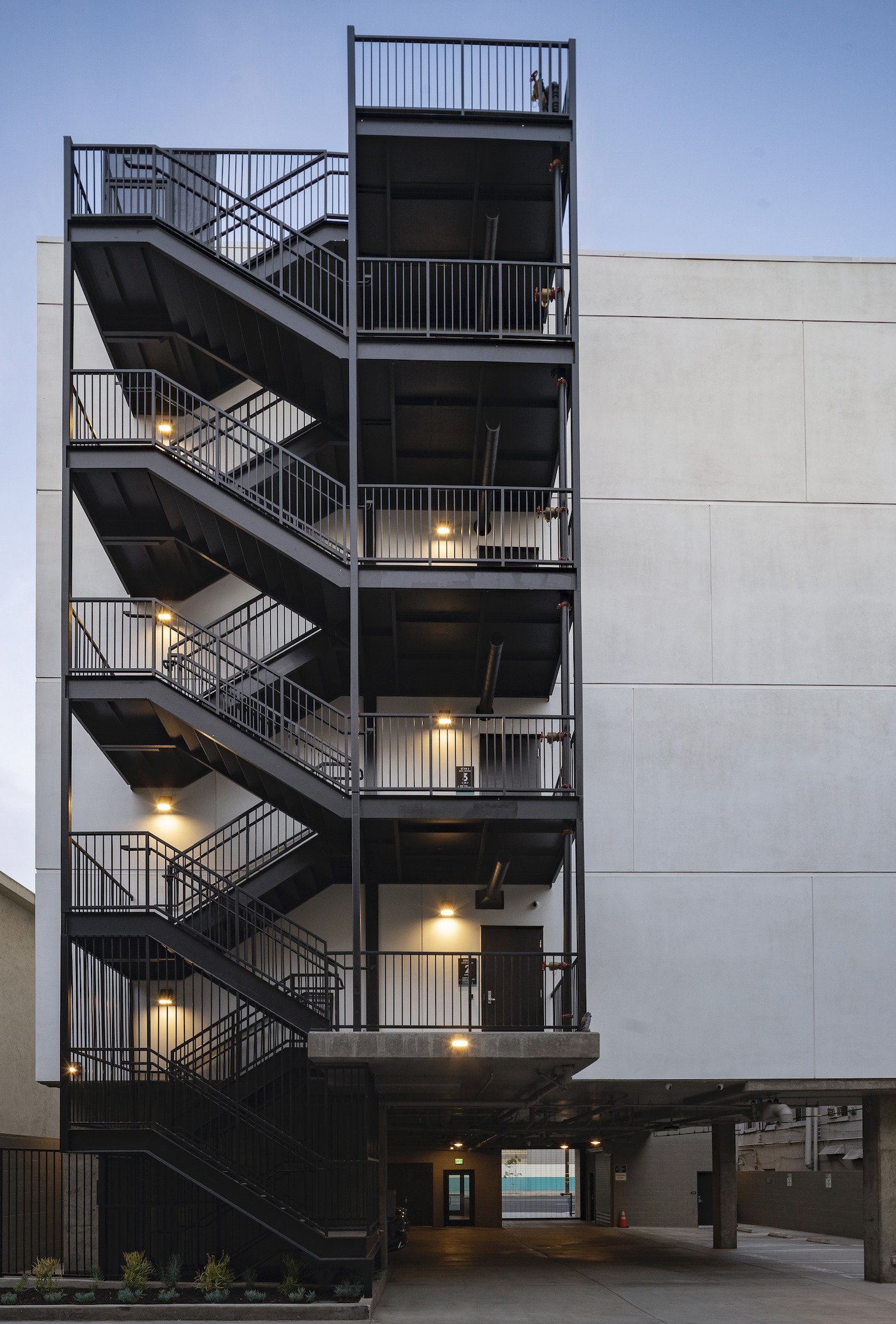 La façade avant met en valeur la circulation, les paliers des ascenseurs et le hall avec un motif alterné de panneaux métalliques nervurés réfléchissants et de baies vitrées orientées vers des vues lointaines sur la montagne et le centre-ville. La façade latérale, une toile blanche tracée, est trouée par les fenêtres en caisson des chambres. La façade arrière contient un escalier de sortie expérientiel tectonique, reliant le rez-de-chaussée au toit.