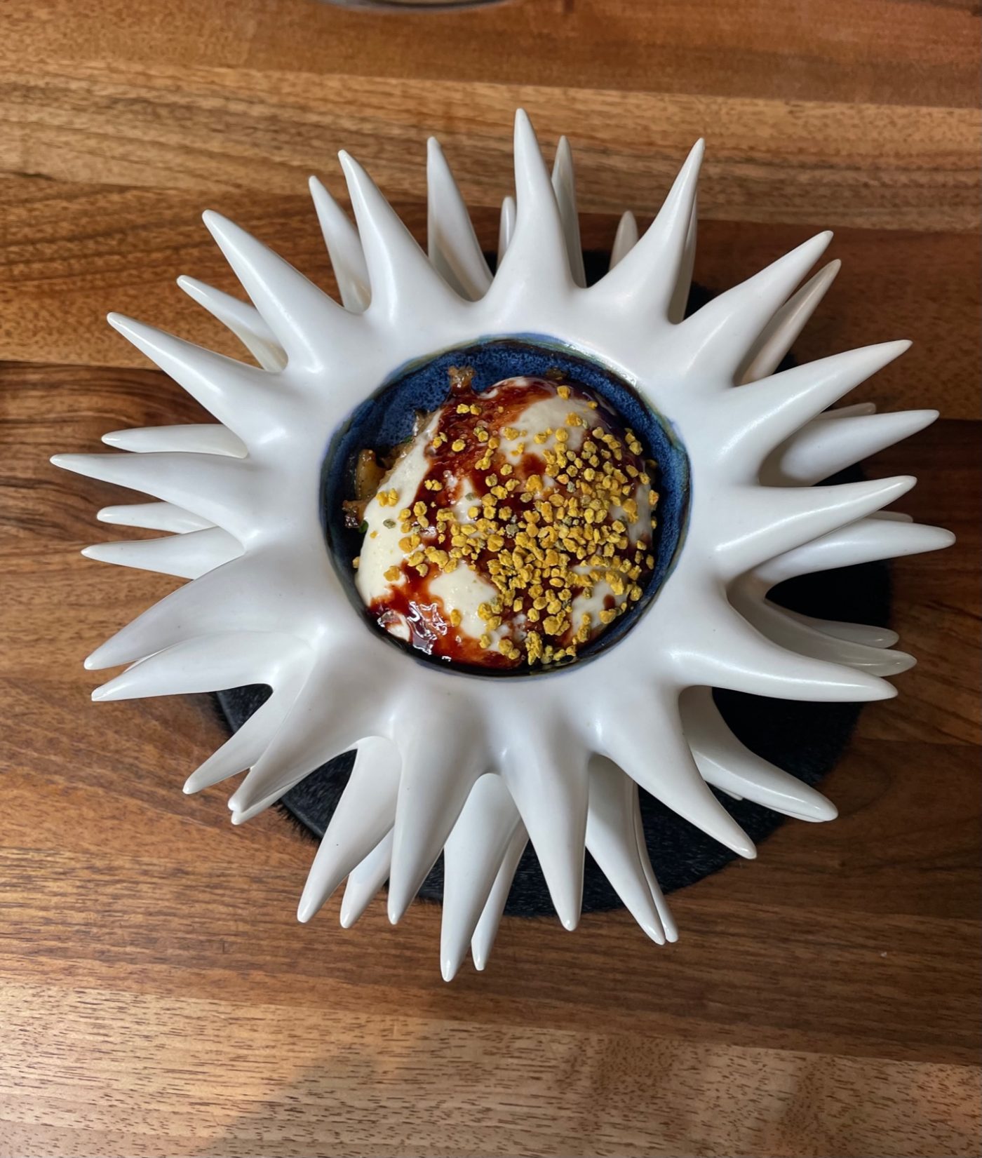 On connaît avant tout le travail insoumis de ce chef éclairé, mettant un point d’honneur à défendre une cuisine authentique tournée vers « la bonne chair ». Au sein de son royaume où la nature est choyée autant que fantasmée, il établit un style personnel et généreux où le sens du contact humain comble le client. Cette formule sans ambages, où le sourire dicte la passion et l’entraide en cuisine, fera très vite le succès de son adresse de la rue Amelot « Qui Plume la Lune » qui décrocha en 2014 sa première étoile. Plus récemment sa boulangerie-boucherie « Suzanne et Lucien », face à sa brasserie « Les Mérovingiens » à Noisy-le-Grand exprime tout le tempérament de ce Breton pur jus fonctionnant au coup de cœur. En effet, Jacky Ribault est un entrepreneur qui aime les aventures culinaires et les belles conquêtes dans un goût de la terre et de la marmite joyeuse. Formé auprès de Pierre Hermé, Alain Passard et Philippe Legendre, celui qui a donné à son restaurant son propre surnom d’« ours » sait qu’il est important d’aller au bout de ses rêves. C’est donc naturellement vers le repère de L’Ours à Vincennes que l’on décide de faire l’expérience du princier menu en 6 temps « Le Thei de Bretagne ». L’accueil prévenant et le service attentionné de Céline Drouin et d’Audrey Varga en salle nous comblent.