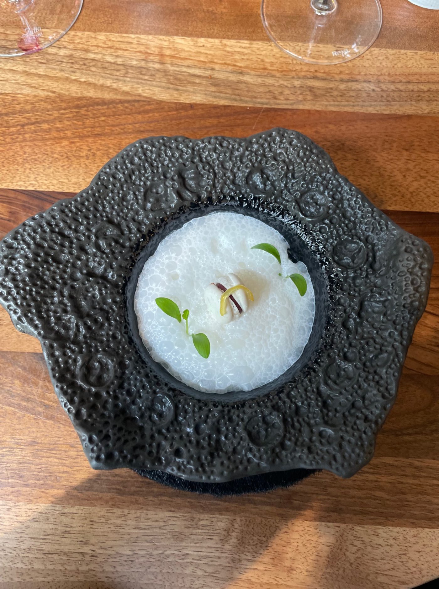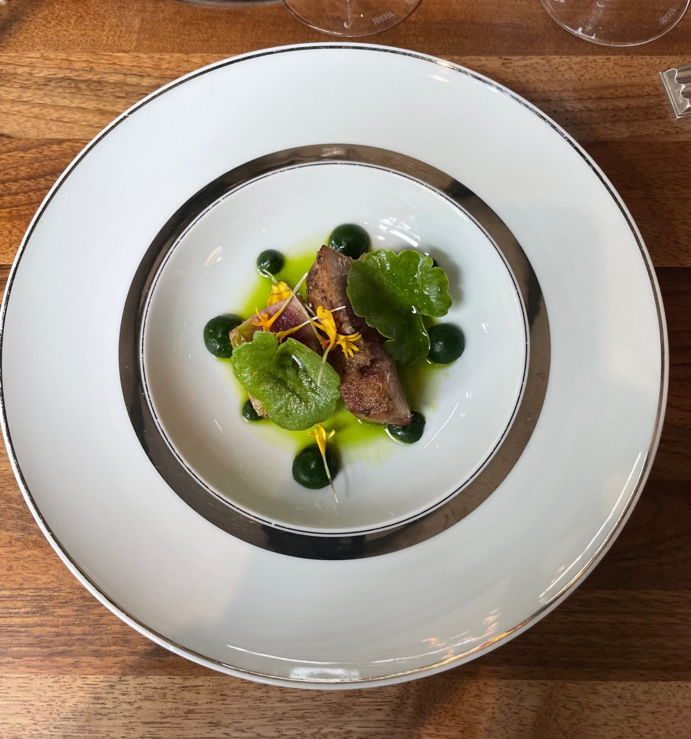 Les avenantes mises en bouche annoncent un raffinement fait de sensations et de plaisirs. Etourdissante, la première entrée nous livre une divine ponctuation qui éveille aussitôt tous les sens avec ses ormeaux poêlés, sa pâte de citron, son syphon fumet de poisson et son jus porto. L’allégresse qui voit le jour dans l’assiette nous conduit ensuite sur une nouvelle décharge de joie en bouche avec l’arrivée flamboyante du thon rouge au four, coulis de cresson, sabayon miso et huile de livèche. On est à la fois pantois, enjoué et réjoui face à cette candeur qui bouscule amoureusement nos papilles. On sent que le chef a mis ici tout son cœur sans génuflexions. Le jeune sommelier Alexandre Cavereau nous promet de belles surprises aussi avec notamment l’annonce d’un élégant vin d’anjou minéral et floral très printanier au caractère légèrement poudré.