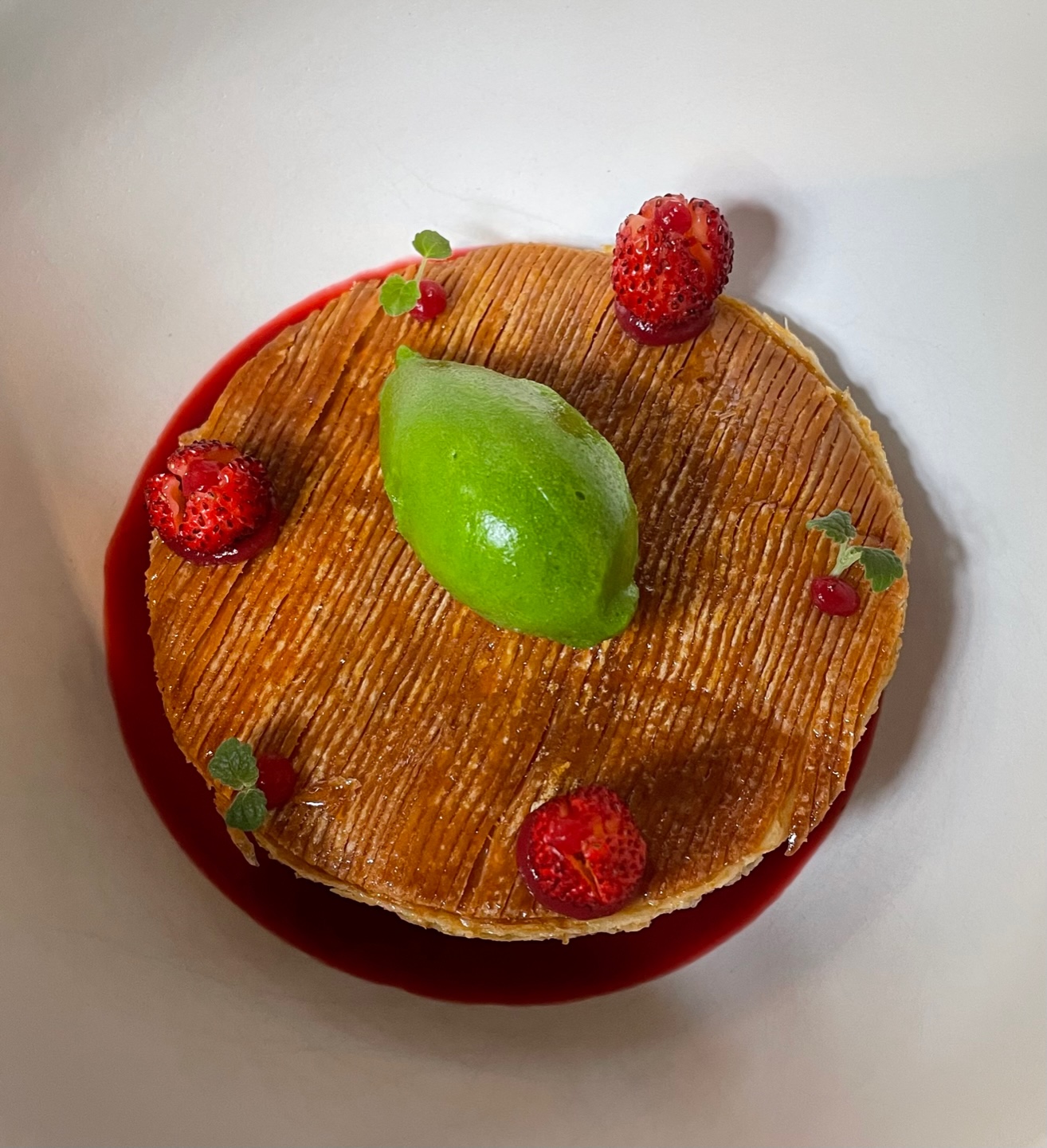 Le plat suivant nous conforte dans notre intrépidité avec l’audace d’un bouillon japonais dashi froid en gelée, des œufs de truite et de saumon de fontaine, un sorbet de tomate green zebra, salicornes avec, à proximité, une brioche feuilletée citron sésame. On se dit secrètement que notre formidable dégustation a encore tant de choses à nous dire. C’est alors que survient celui que l’on attendait religieusement : le magistral ris de veau façon meunière et anguilles fumée du Val de Loire, sauce betterave, sésame, umebushi. Un ravissant jurançon sec nous fait voir les contreforts des Pyrénées aux terroirs ventilés parcourus par son vent Foehn sec et chaud. L’assiette nous fait prendre notre envol pour se confronter à une autre fabuleuse anthologie, celle de la cane criaxeria avec sa farce au foie, miso fumé, cuisse confite, jus marjolaine, chips de cecina, barba dei fretti. Au sein de cette danse de saveurs et de textures, un duo d’asperges, coulis de cresson et tuile de riz apporte son incroyable bonté à ce paysage de gourmandise telle une pudique confession.