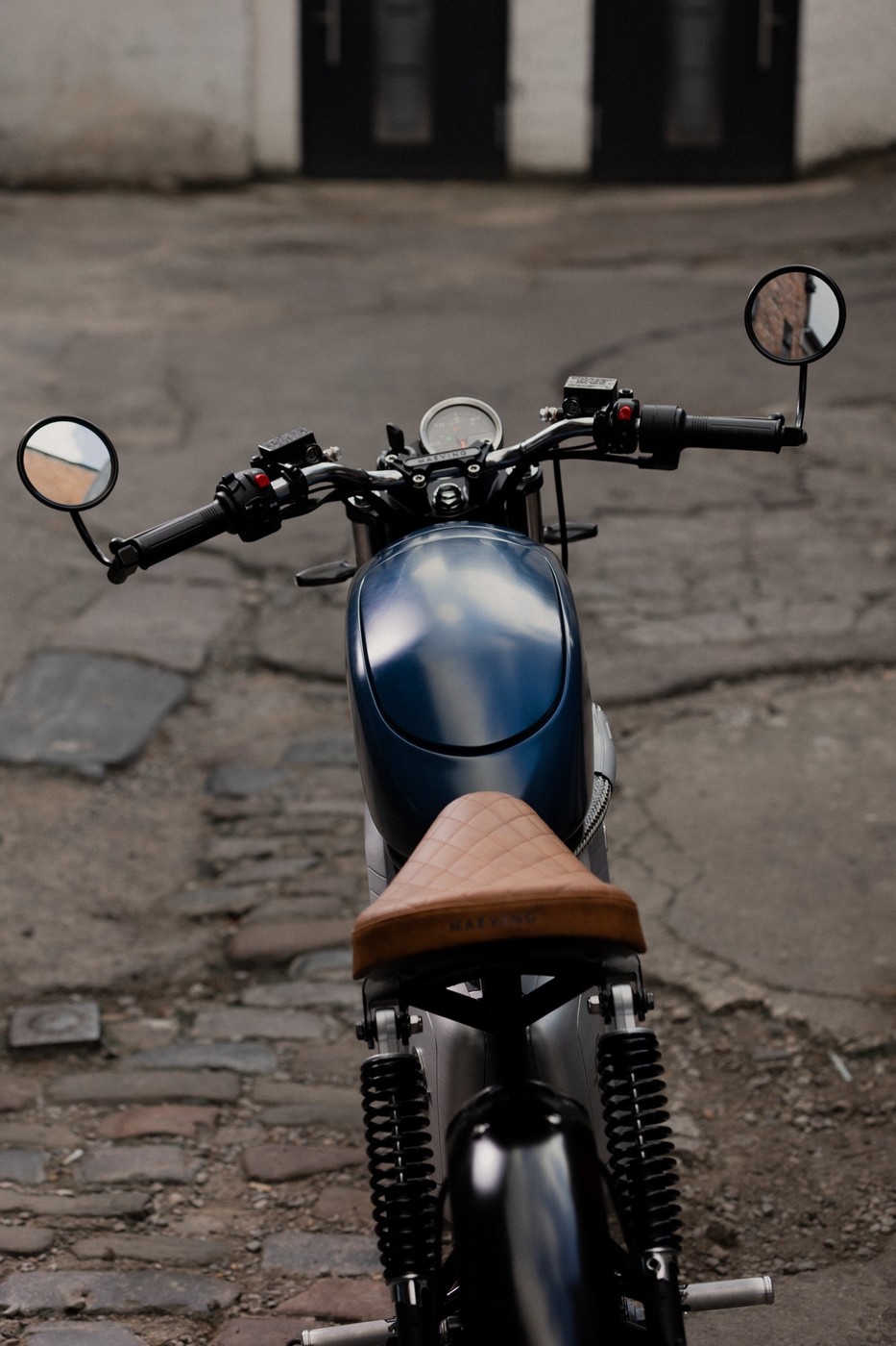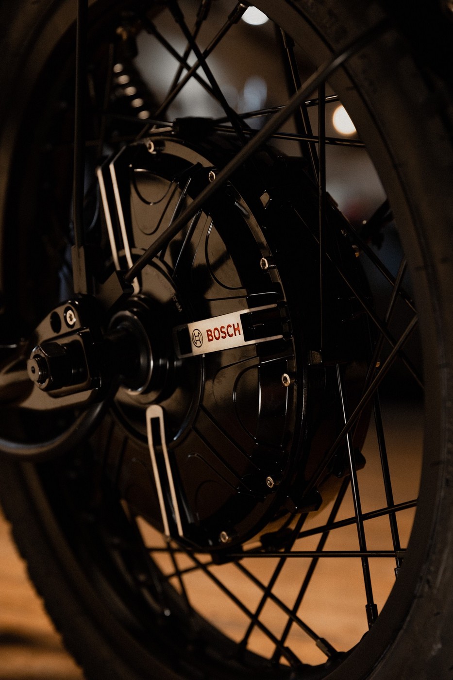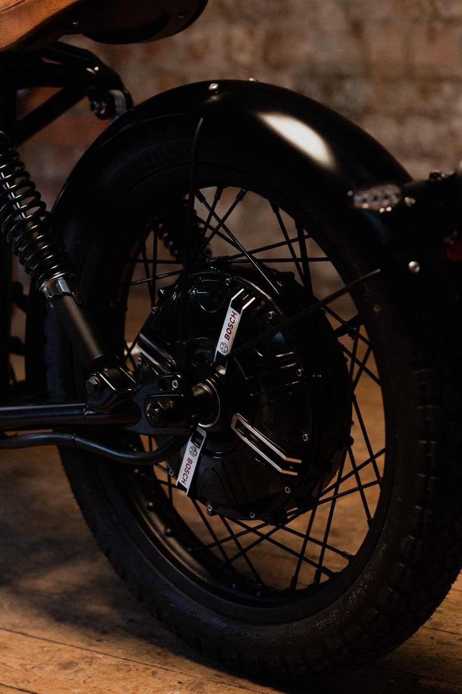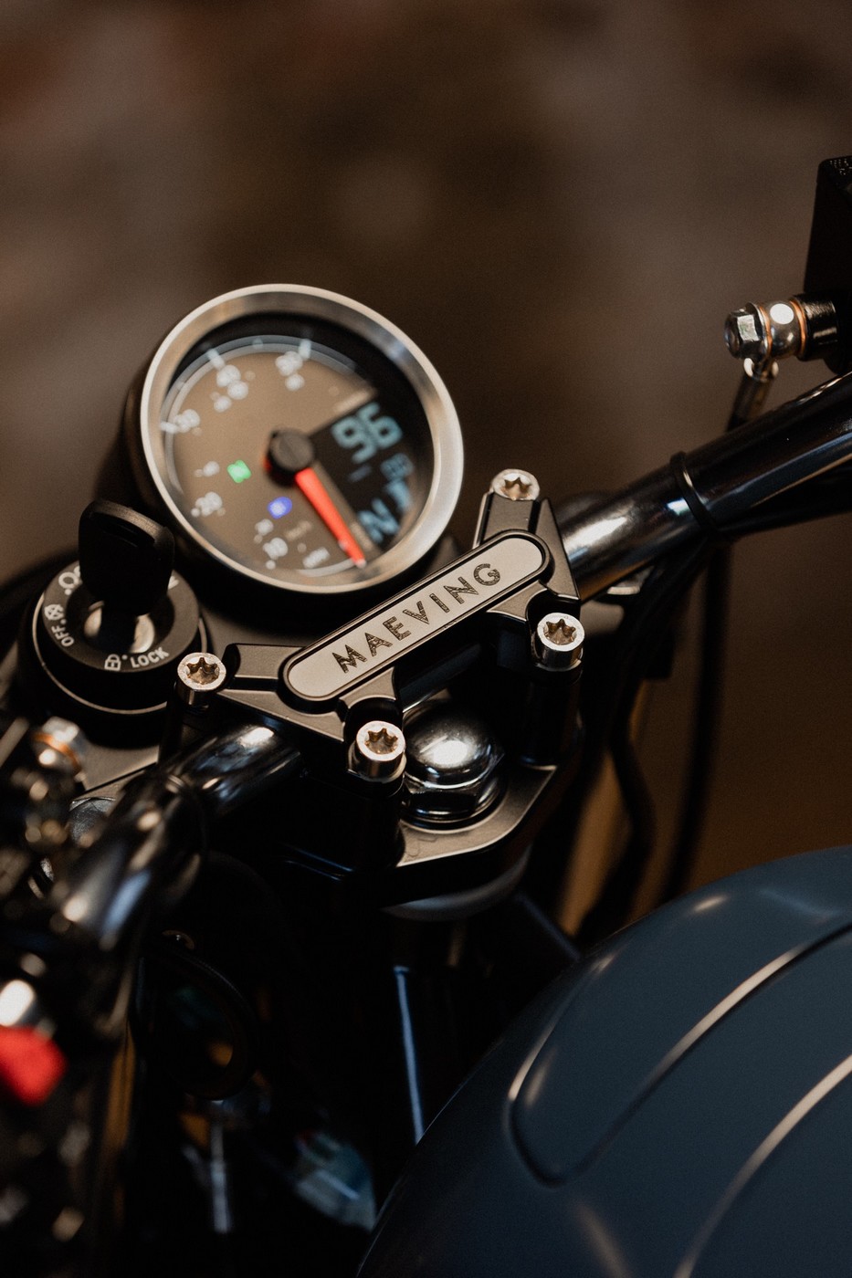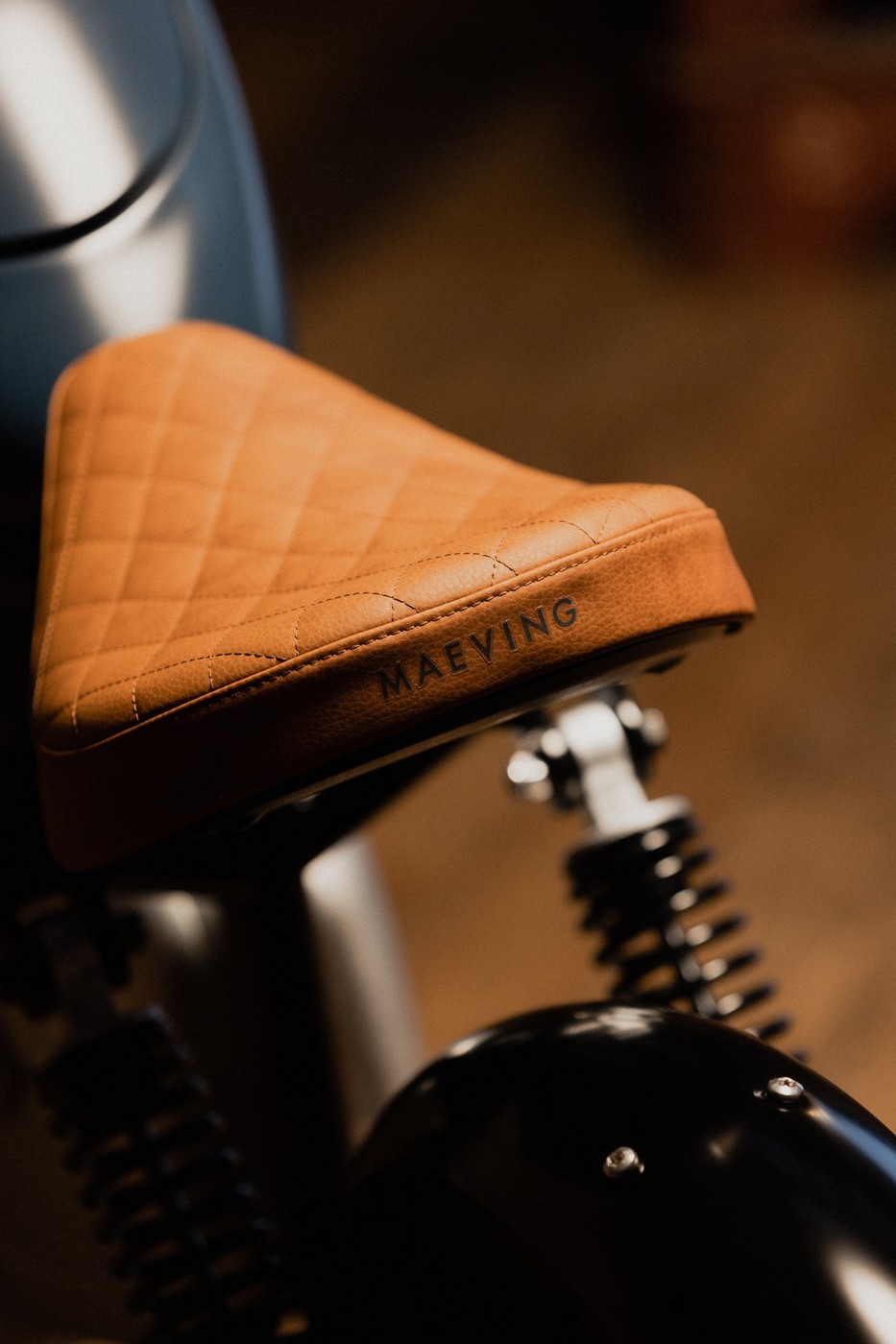Le style vintage de la moto MAEVING RM1 est très Old School, avec des amortisseurs arrière à spirales, un garde boue à l’ancienne noir collé à la roue arrière, son petit phare rond, son compteur minimaliste et rond lui aussi, sa selle monoplace en cuir marron, ses jantes à rayons et ses petits rétroviseurs ronds en bout de guidon.