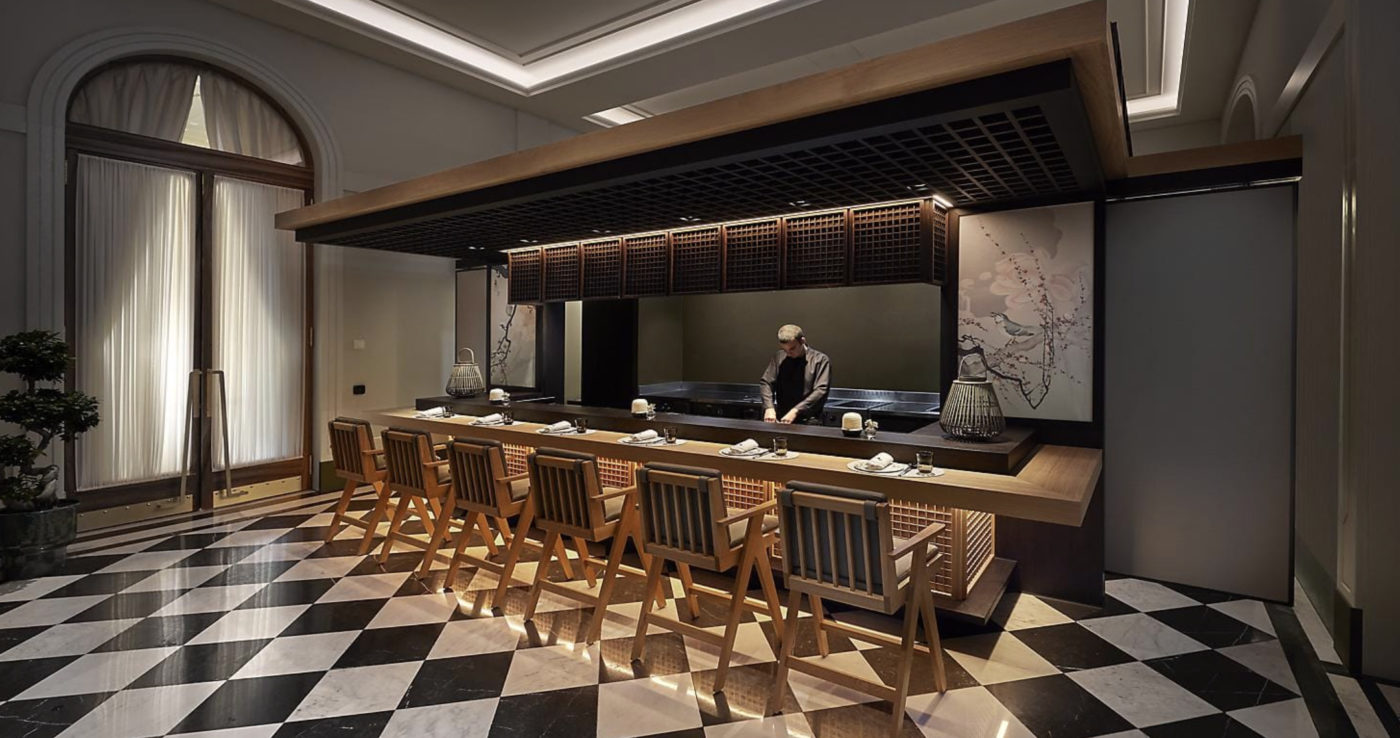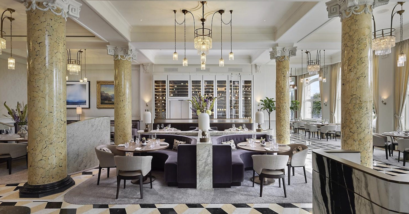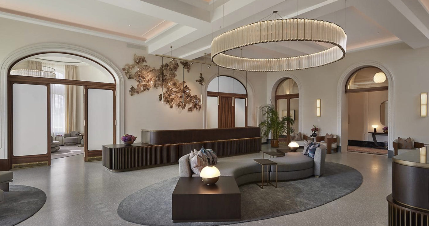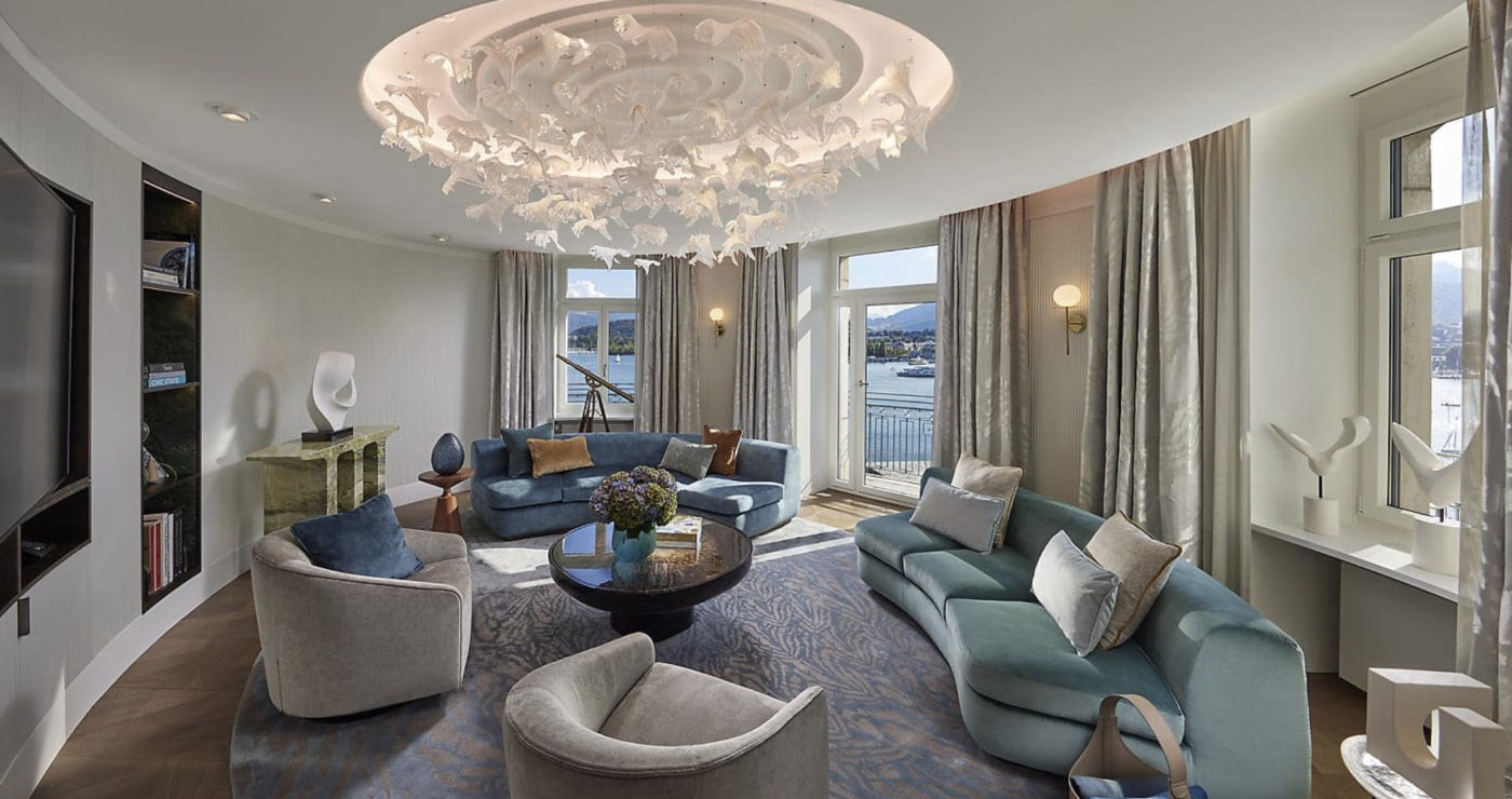 Le palace resté plus d’un siècle la propriété de la famille Bucher offre au regard, dès le rez-de-chaussée quelques somptueuses surprises. On n’échappe pas à la sublime fresque d’époque du lobby, le sol en damier de marbre noir&blanc, les colonnes romaines en scagliola de corail, les tapis tuftés signés par des maison Kramis et Tisca, le mobilier Molteni, l’immense lustre orbital en laiton… Les nuances de bleu et de vert associées à des touches décoratives au coloris ivoire croisent le bois cannelé, le verre soufflé et des éléments patrimoniaux en chêne naturel.