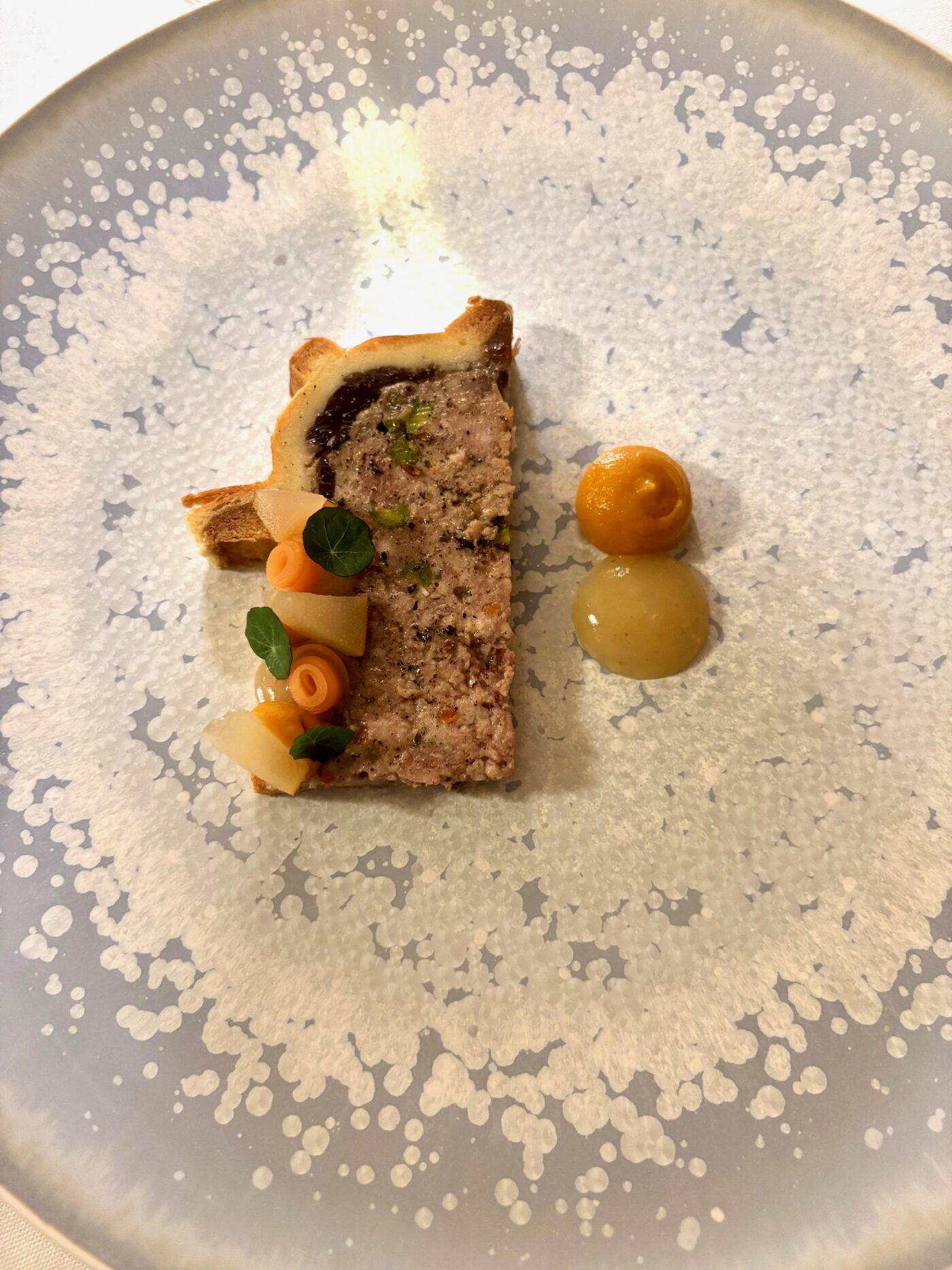 Un peu plus tard, c’est auprès de quatre grandes figures de la gastronomie française qu’il gagnera en technique et précision : Alain Passard, Jérôme Banctel, Michel Rostang et l’inimitable Thomas Boullault. Maxime Lesobre, parisien de souche et fils de boucher, est décidément un oiseau rare qui apprend vite de ses aînés mais qui sait pourtant écouter son coeur et ses envies. C’est hors des sentiers battus qu’il forge sa patte et sa cuisine aux partis pris personnels et affirmés. Nous sommes au coeur de la Côte d’Or, à équidistance de Auxerre et de Dijon, à 12 kms de l’Aube et de la Côte des Bar, avec ses 125 vignerons du secteur et à 12 kms de la Haute-Marne. A proximité, on retrouve la Maison de champagne Fleury pionnière en Biodynamie, les champagnes Moutard mais aussi Drappier faisant écho à Colombey-les-Deux Eglises et au Général. La départementale D 996, qui a donné son nom à un modèle iconique de Porsche, parle au coeur des amoureux de belles mécaniques sur routes de campagne sinueuses. On a fait le déplacement pour vivre, avant tout, une expérience gastronomique, pressentie de haute volée, avec un sept temps sur la nouvelle carte de saison. La maître d’hôtel Sara Devignon nous place, au mieux, avec le sourire des jours heureux. On entame la déambulation culinaire avec un séduisant Pâté en Croute mettant à l’honneur le chevreuil, une mousseline de carotte, poire et gingembre. C’est élégant et très engageant. Le Saint-Joseph Blanc Granit du Domaine Verzier assure le bon accord en « vin des copains ». Le second plat de la vibrante Courge Butternut Confite, noix de pécan , roquette et époisses nous ravit par son hommage aux saisons et la mise en valeur irréprochable du produit.