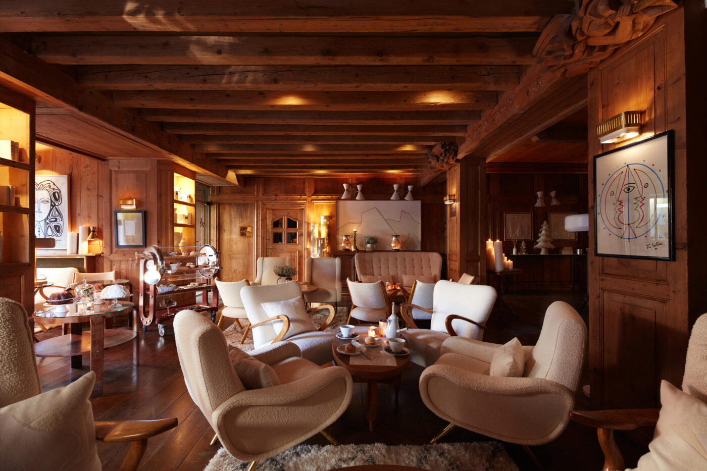 Nos échanges matinaux au coeur de la station confirme le phénomène de la diversification des expériences proposées au-delà du ski. La station a su développer une véritable offre quatre saisons, en particulier sur l’été et l’automne, avec des activités culturelles, gastronomiques et bien-être de plus en plus structurées. Des événements majeurs et attractifs comme Toquicimes participent pleinement à cette dynamique et viennent renforcer l’ancrage gastronomique de Megève, qui fait partie intégrante de son identité. La nouvelle table étoilée « Vous » du chef Julien Gatillon et l’ouverture de The Rabbit Hole, nouveau temple de la mixologie sous la houlette de Thomas Bencze (du Studio Givré et champion de Flair Bartending) attestent de l’énergie et de l’émulation à l’oeuvre à Mégève qui se renouvelle sans jamais se travestir. En effet, rue Saint-François, ce nouveau bar à cocktails fait partie des « place to be » attractive du moment tout comme l’incontournable restaurant de piste Super Megève en sortie de téléphérique de Rochebrune ou le somptueux buffet de pâtisserie du jeune chef visionnaire Kevin Daraud à la Chocolaterie du Grand Hotel du Soleil d’Or disposant du seul bar-rooftop de Megève. Nous prolongeons notre immersion dans le « monde Sibuet » avec la découverte de l’Hôtel Mont-blanc : le plus vieil hôtel de Megève ouvert en 1915 qui fut, dans les années 50, le repère festif d’acteurs, de célébrités et d’artistes. Le Bar des Enfants Terribles accueillit en son temps Jean Cocteau qui y laissa son empreinte et quelques fresques magistrales. Coté gastronomie, la table du Relais du Mont-Blanc opte pour une cuisine réconfortante (plébiscitée pour sa joue de bœuf, ses macaronis au vacherin et truffes ou encore ses quenelles de brochet) sur 70 couverts. L’immanquable Tea time de l’après-ski à 16h est ici une institution dans cet établissement-écrin au blanc immaculé jouissant d’un emplacement exceptionnel car donnant sur la place du village et à deux pas du téléphérique.