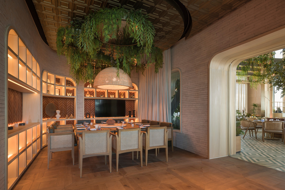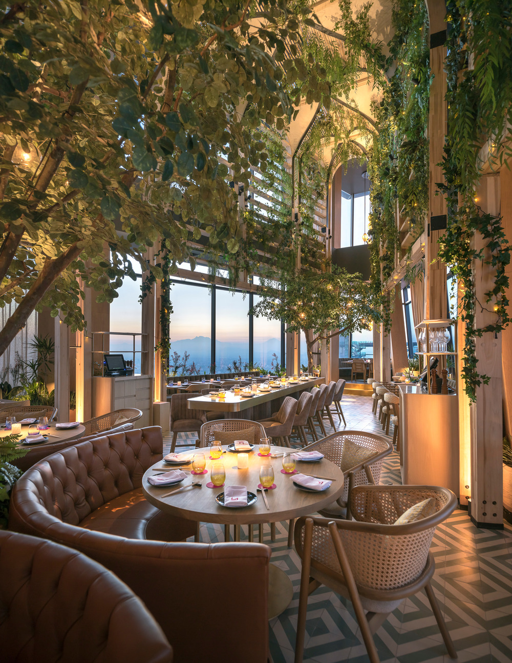 Entourée d’une végétation luxuriante, la terrasse devient le véritable cœur du projet, créant un environnement difficile à imaginer au 56e étage d’un gratte-ciel d’entreprise. Cet espace bénéficie de la triple hauteur et de l’emplacement d’angle pour surprendre les invités avec une structure d’atrium vitré offrant une vue à 270° sur la ville.