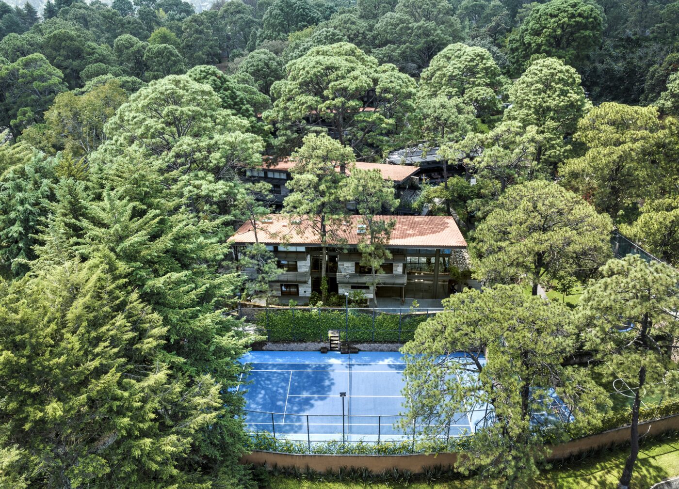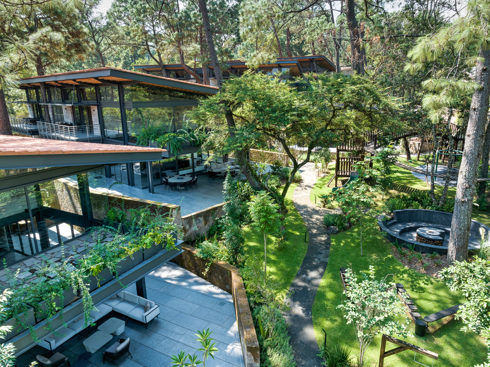 Sur une topographie entièrement boisée et en pente, le cabinet mexicain Grupo Arquitectura a réalisé un projet de 4 maisons indépendantes à deux niveaux avec leurs commodités communes. Dès la première visite du site, les architectes ont vu ces énormes arbres et ont décidé de ne pas les toucher et ont implanté les maisons de manière presque chirurgicale, en s’adaptant aux dénivelés et aux conditions naturelles du terrain. Le résultat final donne l’impression que les maisons ont été construites depuis des années et que la végétation ait été plantée en même temps que la construction.