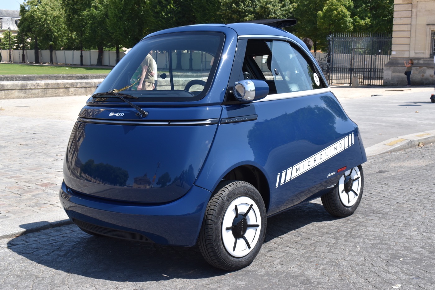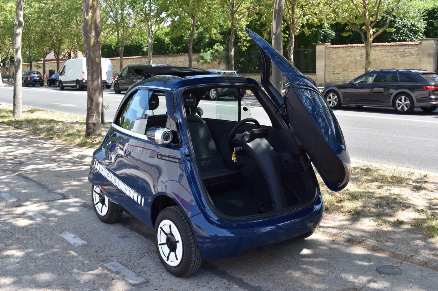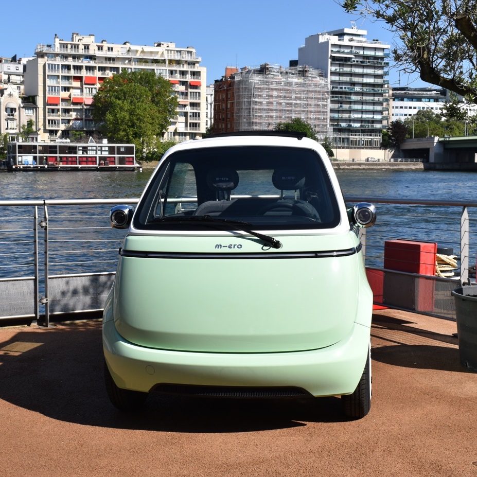 La voiture compte 2 places et un coffre qui contient tout de même 230 litres. Elle est nerveuse (0 à 50 km/h en 5s), agile et hyper pratique pour se garer grâce à ses dimensions : 2,51 mètres de long x 1,47 mètre de large et 1,50 mètre de hauteur. Avec un poids plume de 496 kg, on a plus l’impression de conduire une moto qu’une auto. L’autonomie maximale est de 230 km et il suffit de 4 heures pour la recharger entièrement sur une prise domestique. Dotée de 4 petites roues, la Microlino bénéficie d’un incroyable capital sympathie. Notre balade dans les rues de Paris n’a croisé que de grands sourires, des pouces levés et de nombreuses questions. Les femmes l’ont particulièrement adoré et ont fondu sur son côté vintage. Et l’entrée dans le véhicule par la face avant a fait craquer tous les badauds. Bref, cette Microlino est simplement géniale !