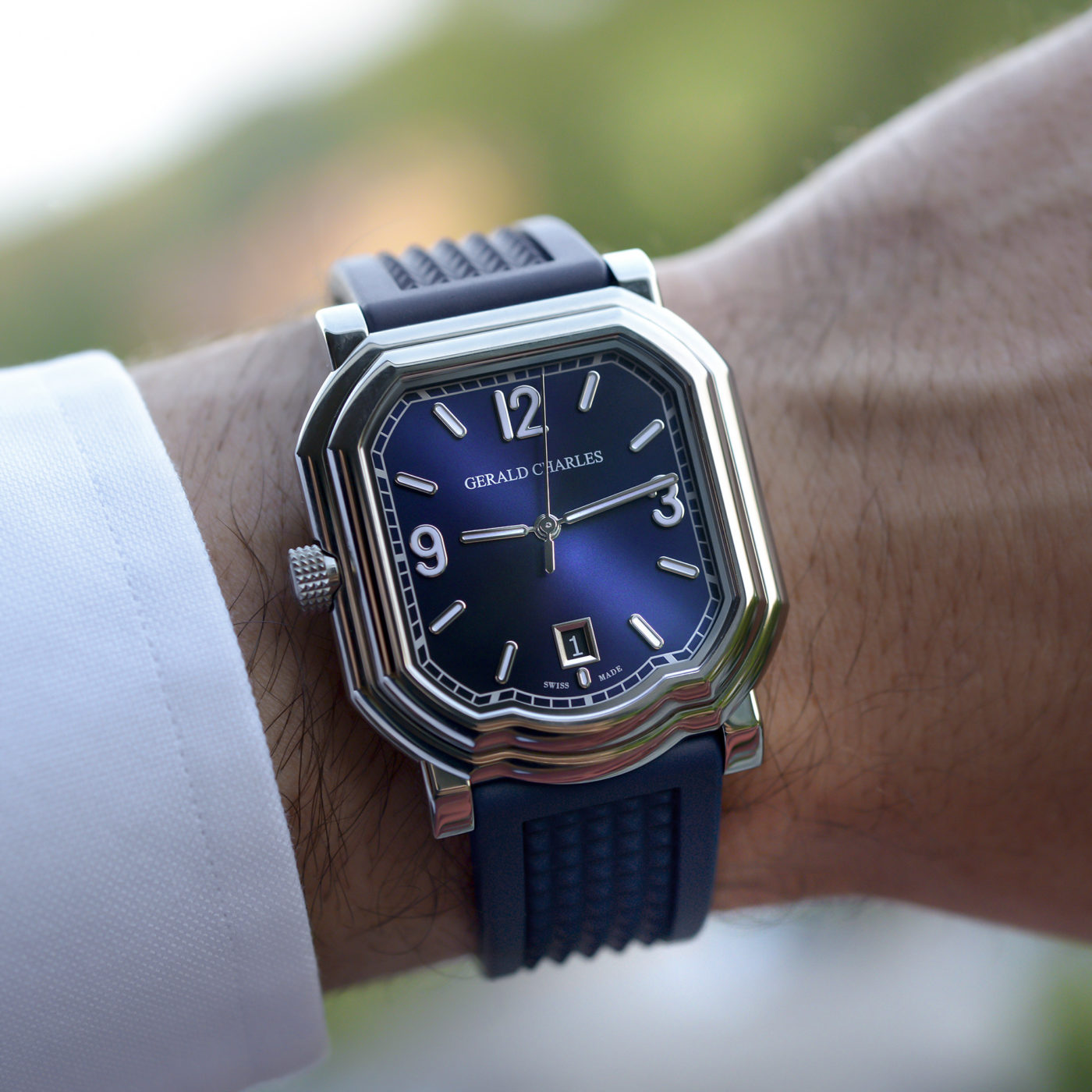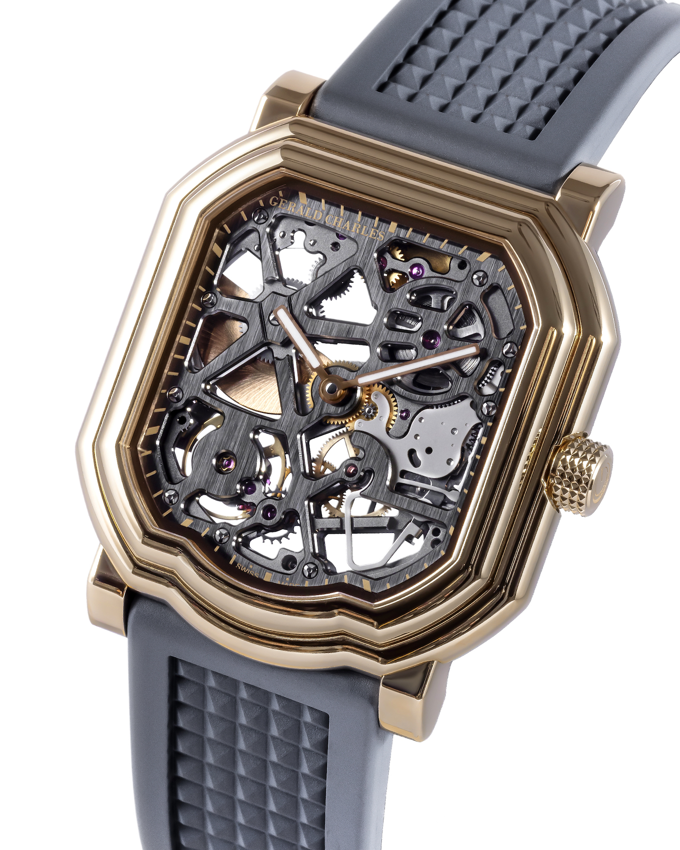 La Maestro, qui doit sa forme originale à un monument italien baroque du XVIIème siècle, dessiné par  Francesco Borromini, combine le carré et l’octogone avec un sourire à 6 heures. Très identifiable par sa forme, elle reste fidèle à la grande tradition horlogère, équipée d’un calibre mécanique animé d’un microrotor décentré, développé en collaboration avec Vaucher Manufacture Fleurier. La construction complexe de son boîtier comporte 35 éléments distincts, (39 pour le chronographe), assemblés à la main, tandis que sa silhouette très originale multiplie les angles rentrants et sortants, les arrondis, les surfaces convexes et concaves pour un résultat qui capte la lumière. La masse oscillante, décorée d’un motif hexagonal « Nid d’abeilles », emblématique de la Maison et inspiré de l’architecture baroque, a été imaginée par Octavio Garcia, le directeur de la Création. L’esthétique de Gérald Charles, ancré dans son histoire et son prestigieux patrimoine, s’appuie sur des détails qui lui sont chers , de la forme des aiguilles, aux index et à la finition Clous de Paris, construisant ainsi sa propre identité.