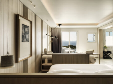 Depuis son ouverture, ce nouveau fleuron de Myconian (qui est l’un des rares hôtels de plage 100% pieds dans l’eau de Mykonos), portant la signature de l’architecte franco-libanais Galal Mahmoud, surprend sa clientèle en combinant admirablement le charme traditionnel propre à l’archipel et un quelque chose de totalement captivant avec ses touches discrètes bien senties distillées, avec goût, dans les différents espaces de l’établissement en osmose avec la nature et l’artisanat local. On se croirait parfois du coté de Palm Spring dans cette oasis de fraîcheur avec cette piscine étincelante bordée de palmiers et de tamaris au pied des montagnes arides. Coté Suites, les espaces intérieurs et extérieurs, habillés d’objets vintage subtilement chinés, intègrent une architecture presque vernaculaire. Tout semble propice à la méditation et à la contemplation dans cette abolition constante des frontières. Les pièces et éléments de mobilier, aux élégantes notes rétro, dialoguent entre elles dans des paysages changeants croisant ombres et lumières.