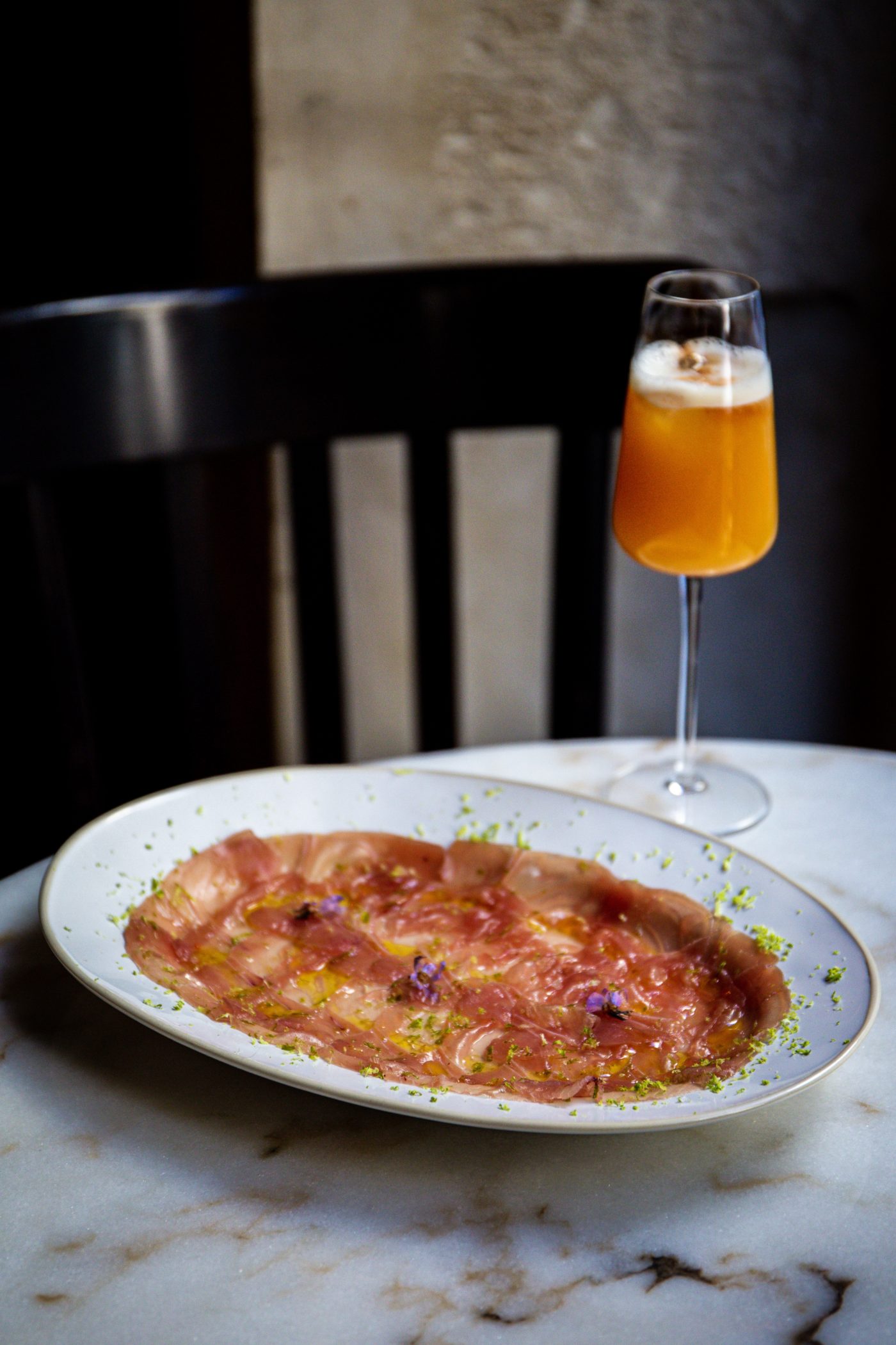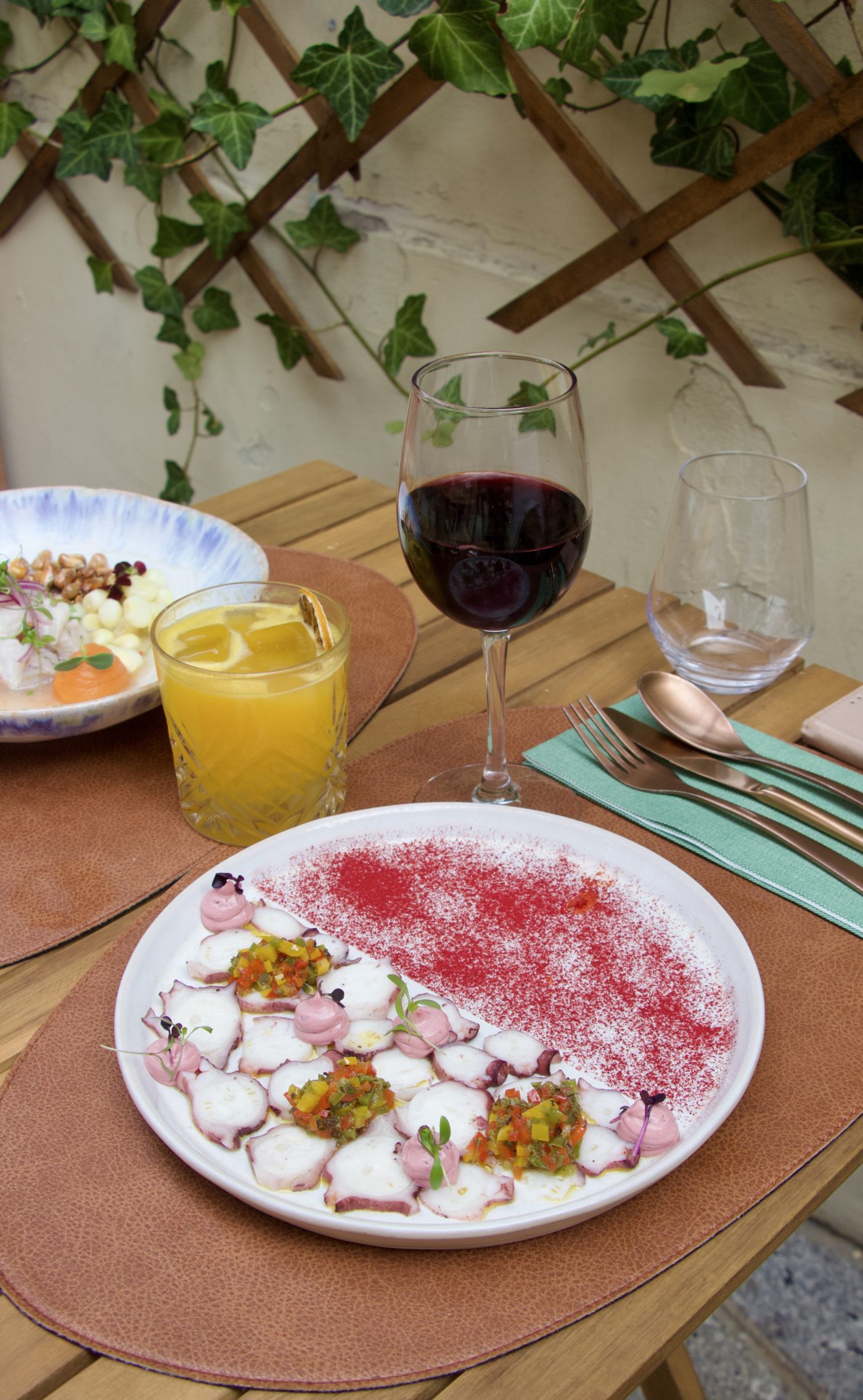 L’adresse de la Villa9Trois ne laisse, dans les hauteurs d’un Montreuil – davantage résidentiel que gastronomique – au premier abord, nullement présager de l’existence d’une telle table ni d’un tel dépaysement. Dissimulé derrière un grand mur corail, dans le prolongement d’un potager bien garni de verveine, de citron et autres pépites de toute sorte destinées à l’assiette – où se prélassent les chats de la maison – on distingue bel et bien une terrasse bordée par un bâtiment en terre cuite. De toute évidence, le beau temps se doit d’être au rendez-vous afin que les équipes puissent investir pleinement cet écrin de verdure.