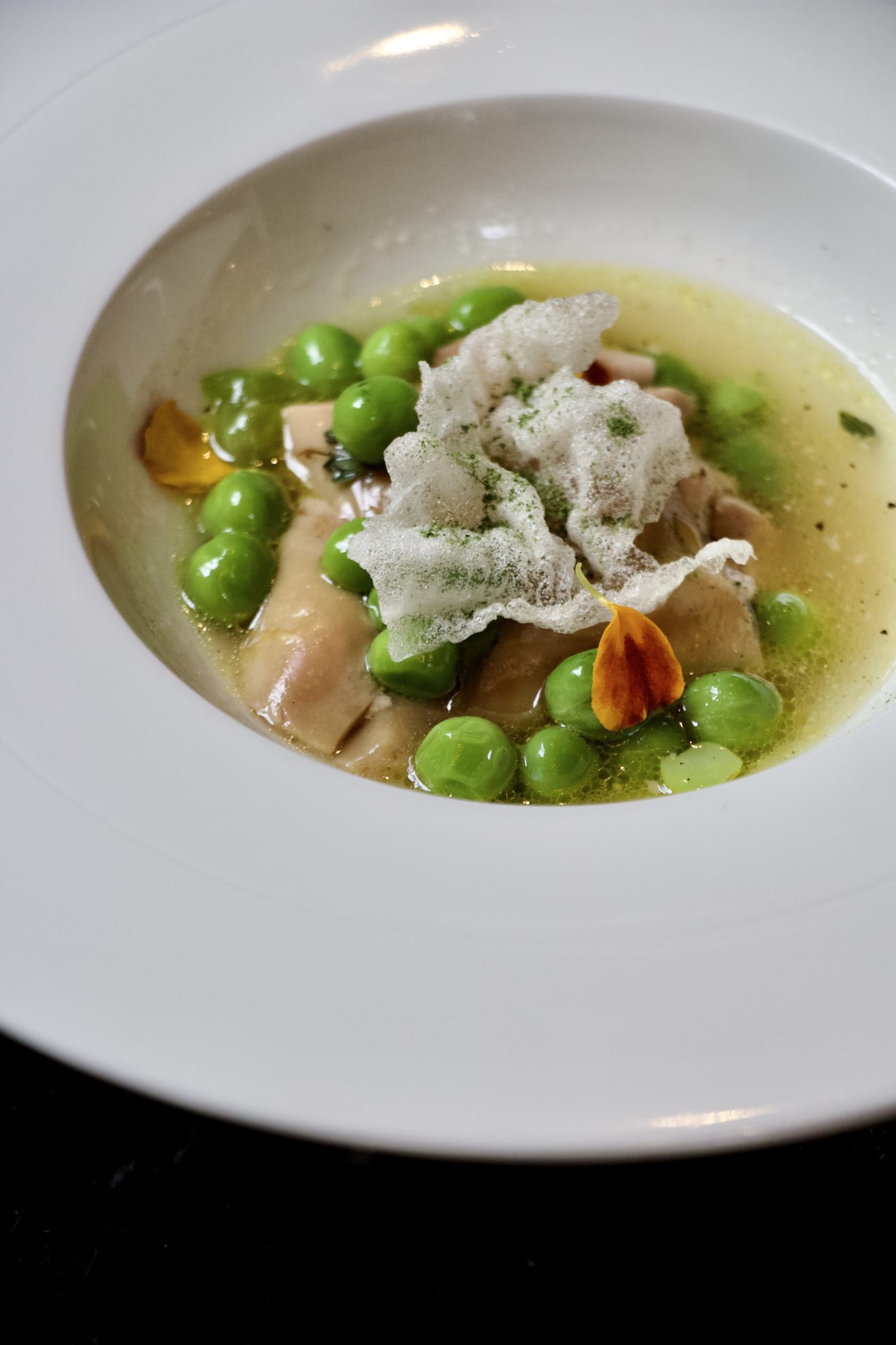 À la carte, les mets raffinés et méticuleux pensés par le chef Camille Saint-M’Leux (Le Taillevent, l’Abeille et le Cinq) ou son second, honorent une dernière fois les denrées estivales. Les petits pois profitent de leur dernière heure, dans une fusion parfaite avec un foie gras en entrée, au même titre que les fraises d’été s’offrent une ultime apparition en beauté, adoucies de crème Fontainebleau. À l’aube de l’automne doré, l’Artichaut ou la feuille de figuier se joignent volontiers à la fête, accompagnant un ris de veau laqué. Une transition en douceur, avant que progressivement les assiettes ne délaissent la chaleur de l’extérieur pour celle des jours abrités, devant une ravissante cheminée d’époque.