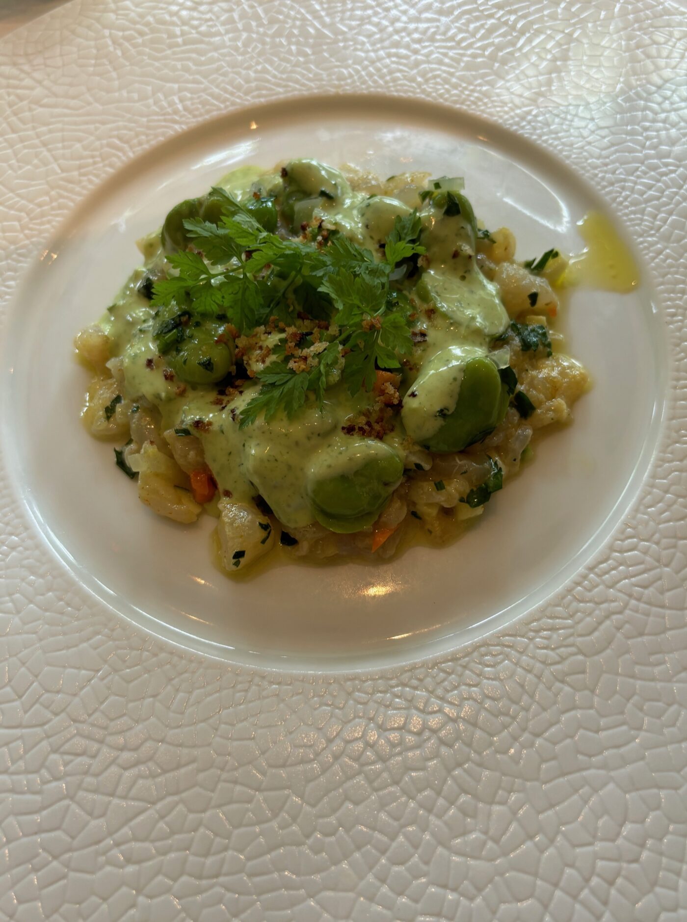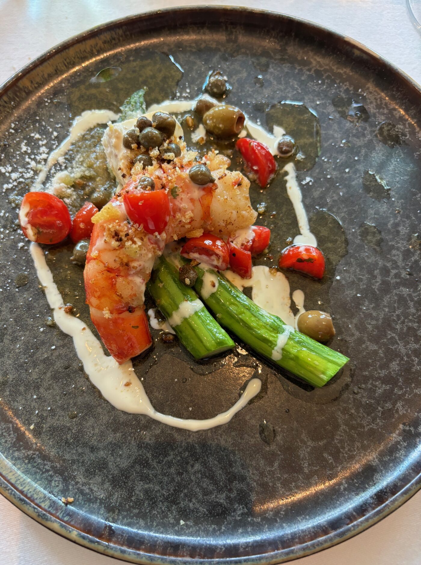 Il nous prépare une sélection de plats, en accord mets&vins, aptes à prendre toute la mesure de son art. Un magnifique tartare de bar de ligne, fèves et pesto nous ouvre l’appétit. Avec cela, le superbe flacon d’un Soave Vigneti di Foscarino Inama, vin blanc tranquille, à base de Garganega et élevé sans utilisation de bois. Arrivent ensuite les ravissantes asperges vertes alla parmigiana et grosse gambas juste saisie à la méditerranéenne. Ce plat nous emplit de joie en nous plongeant, sans retenue, dans les merveilles de la douce région de Campani grâce à un sublime vin blanc, en mono cépage local falanghina élevé en cuve d’acier et fermentation en levure indigène.