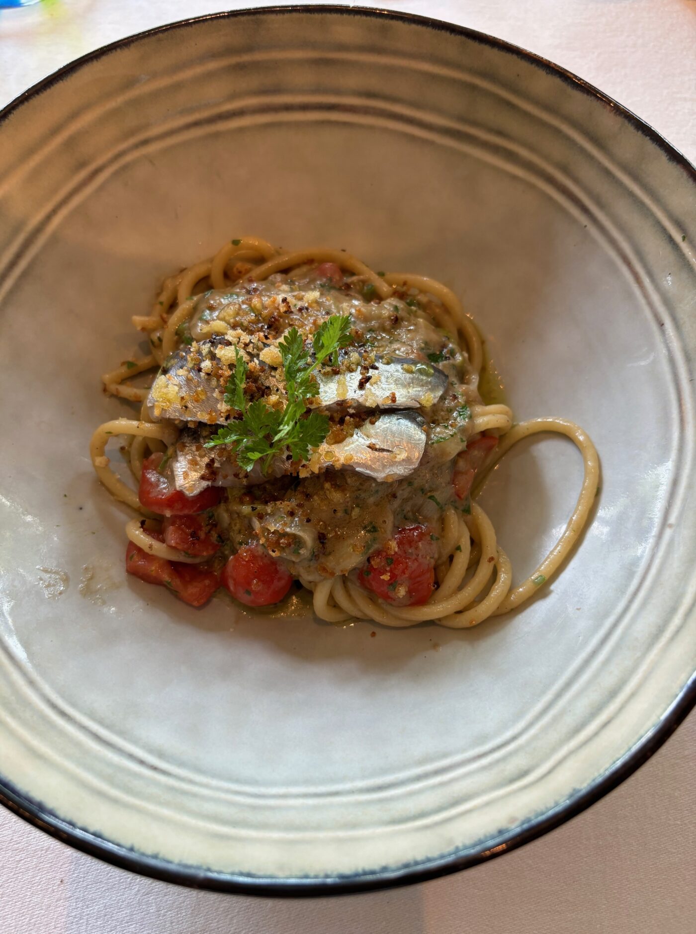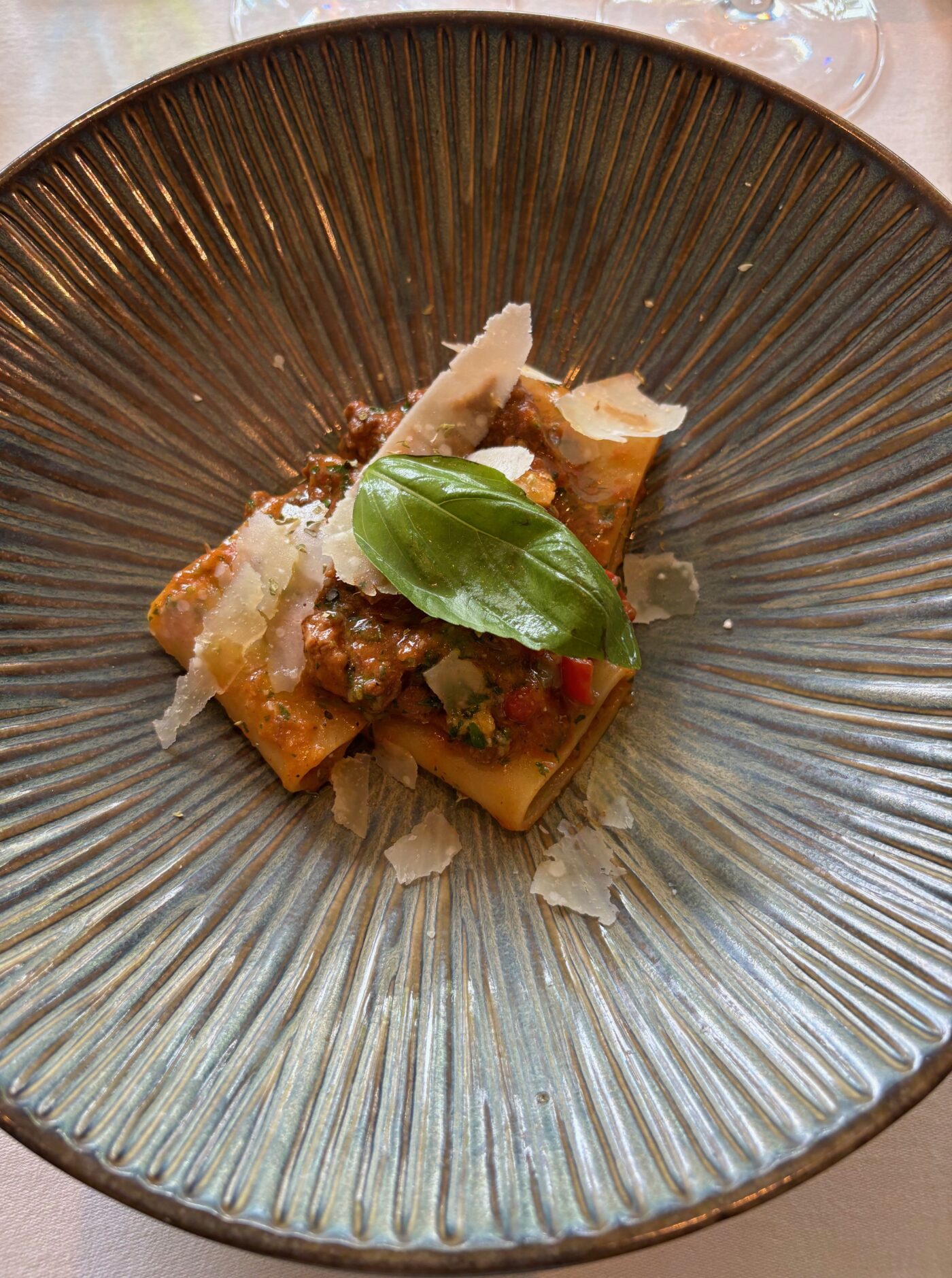 Dans la foulée, une petite terrine de foie et de volaille rend hommage à la province autonome du Trentino. Flore propose d’accompagner cet instant magique d’un très beau nectar aux notes de groseilles et de fruits des bois. On aime ces tanins doux, entre belle complexité et longueur. Nous poursuivons notre déambulation culinaire, dans l’allégresse et l’échange, avec un plat terre-mer de haut vol : les fameuses raviolis de crabes et crème douce de cèpes. C’est réconfortant et les saveurs se fondent entre elles en échappant à des juxtapositions sans intérêt. L’assaisonnement et la cuissons sont parfaitement suivis. Quand se présente, le plat signature du chef, l’immanquable spaghetti-sardines à la Sicilienne, on constate que l’on est soignés par les équipes de l’établissement de bonne tenue qui donnent le meilleur d’elles-mêmes. C’est alors que l’on tend les bras à un remarquable Barolo de la région de La Morra sur l’une des plus belles parcelles.