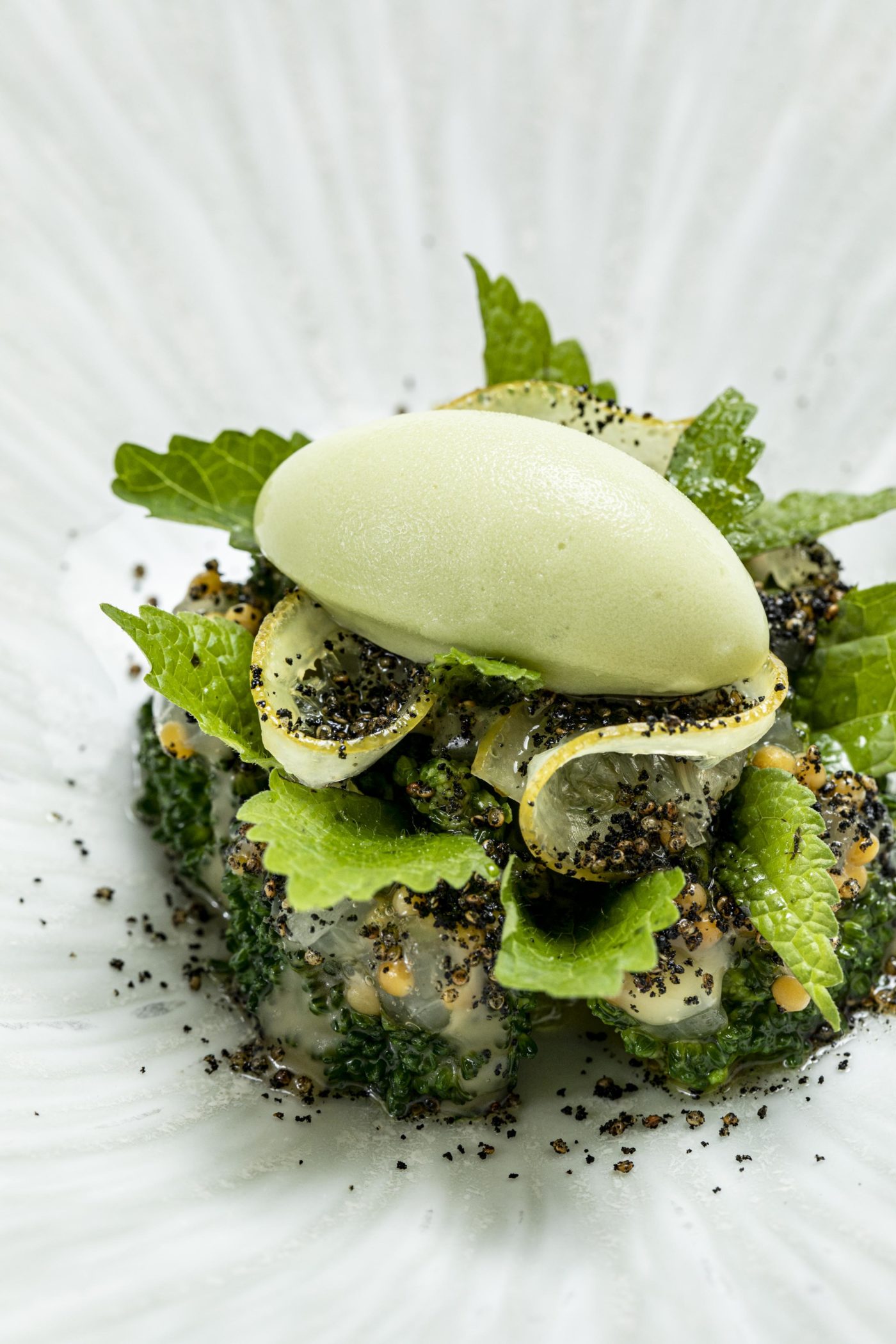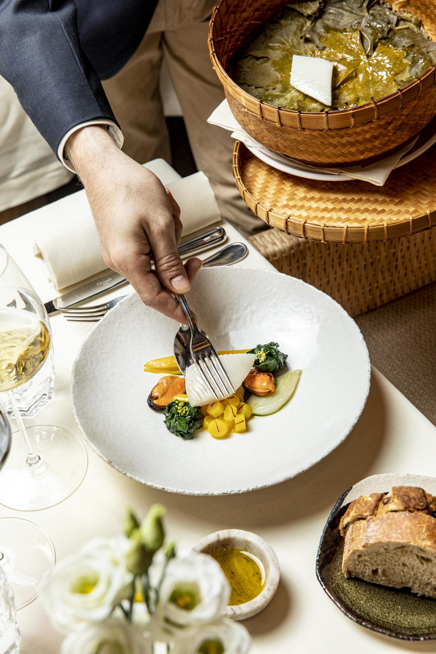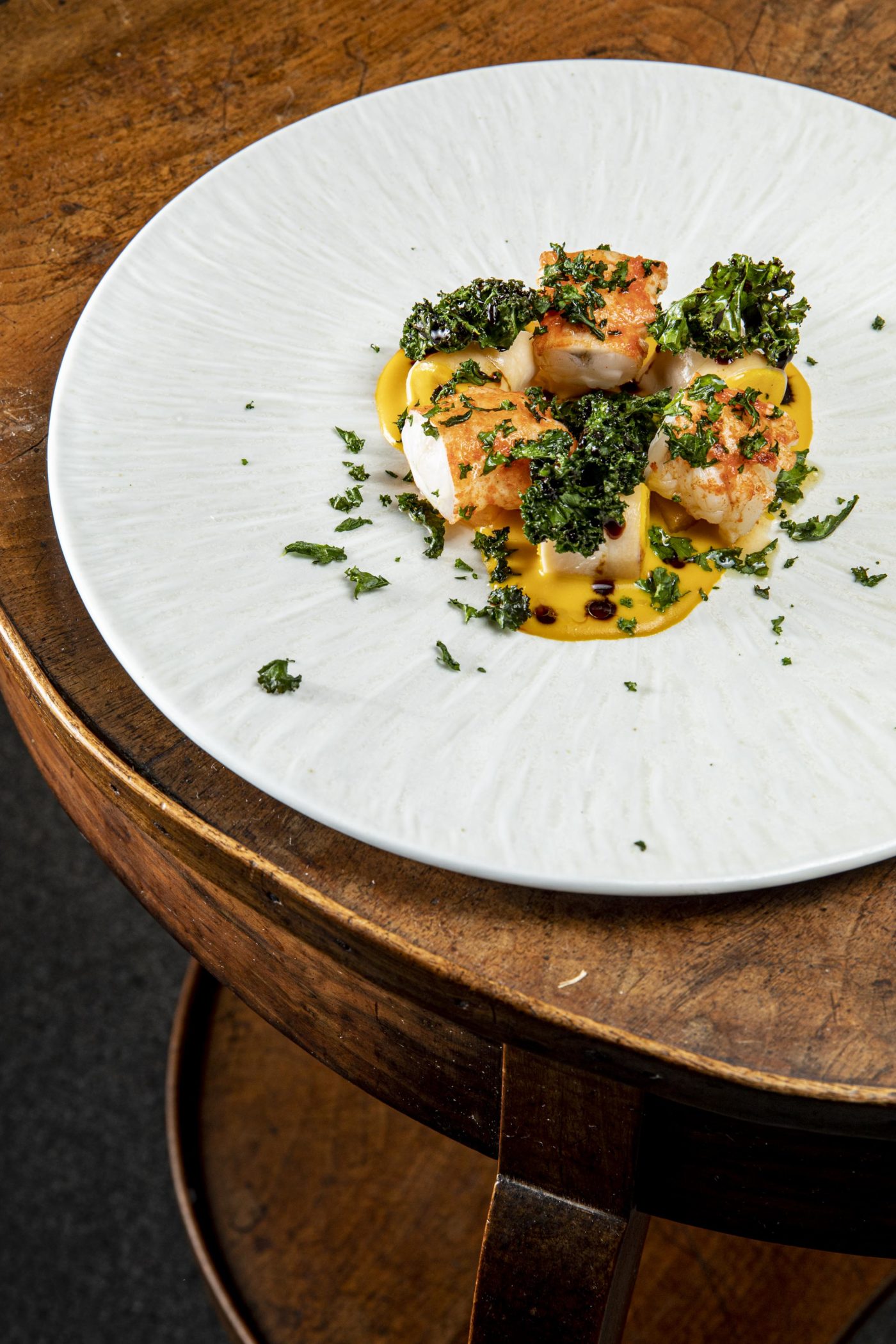 On se lance, au cœur d’un apaisant décor aux teintes naturelles et à l’esprit minéral, dans la prometteuse dégustation 9 séquences baptisée « d ‘Athènes à Paris ». Le brocoli, citron, mélisse et caviar, élevant les péchés du monde, nous emmène illico sur des terres enchanteuses de fraîcheur sans pareil. Le respect du produit est indéniable et porté par une essence poétique de la plus sincère élégance. On est prévenu que le brillant chef sommelier, Raphaël Cohen, nous réserve quelques magnifiques flacons comme l’expressif Chablis 1er Crû 2016 de chez Christophe et Fils, le ravissant vin d’anjou Les Gâts du Domaine Patrick Baudoin ou encore le flatteur Condrieu les Grandes Chaillées de Stephane Montez. La partition, forte de ce magnifique préambule se met en place progressivement avec l’arrivée de l’angélique langoustine, butternut, kale et gingembre.