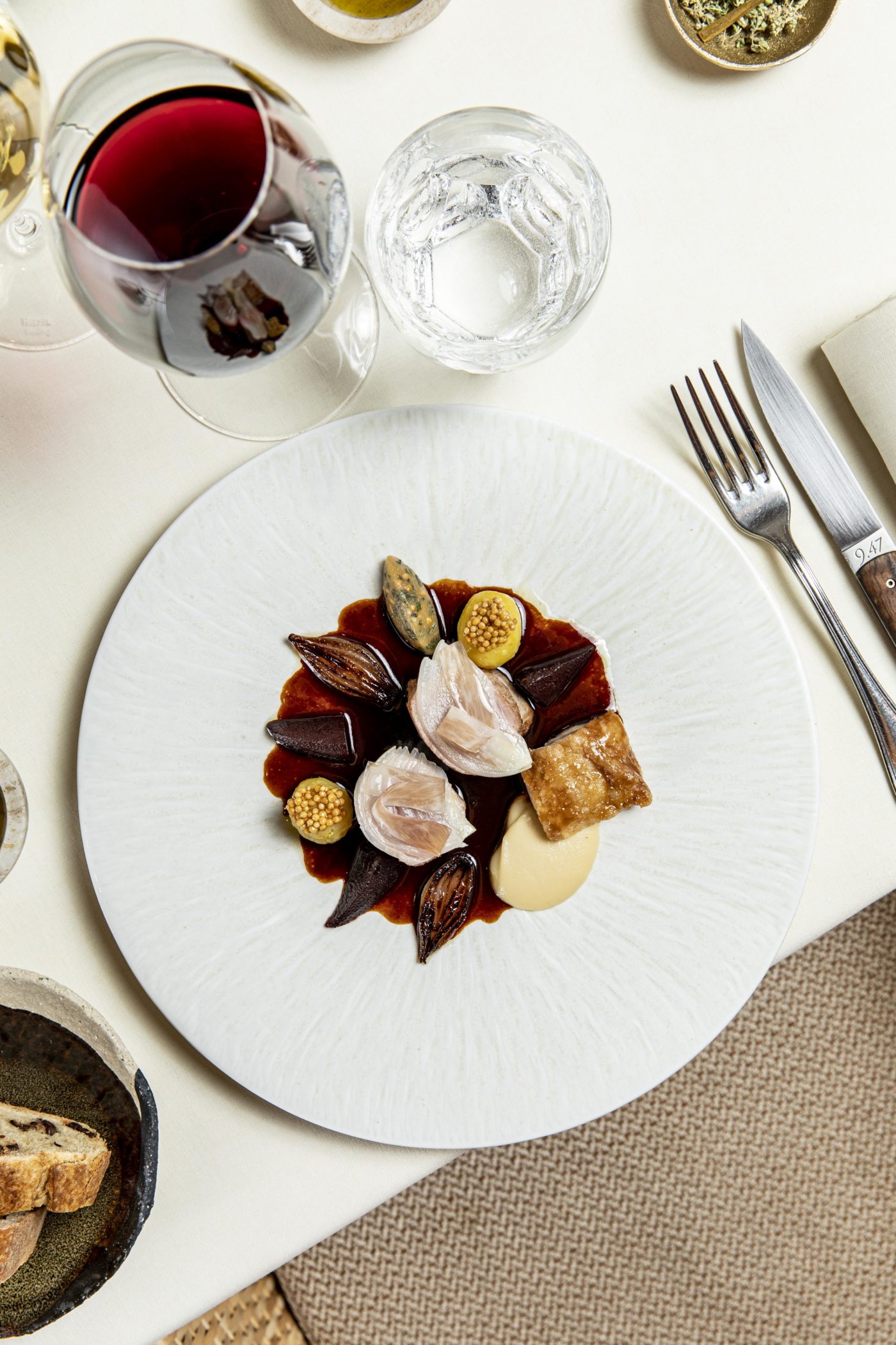 Les plus beaux produits vibrent au palais et nous annoncent déjà l’instant crucial de ce moment d’exception. En effet, très attendu, le veau, coing, oignon et moutarde nous laisse sans voix. La cuisson est parfaite et se passe de commentaire. Les condiments font rayonner l’ assiette sous leurs plus beaux attraits. L’orchestration en salle, sous l’égide experte et bienveillante du directeur Ahmad Houmani, nous enchante. La venue du majestueux Saint-Pierre, safran, salsifi et kaffir ne laisse pas de place à l’erreur pour le chef qui nous livre les secrets de ce poisson noble s’adressant à un club très fermé des connaisseurs. On est catapulté en orbite. Le cortège des vins ne nous laisse pas reste : le puissant Côte de Nuits Morey-Saint-Denis d’Aurélien Verdet nous couvre de sa fraîcheur, tandis que le Côte-Rotie Les Elotins nous régale des ses arômes de fruits noirs.
