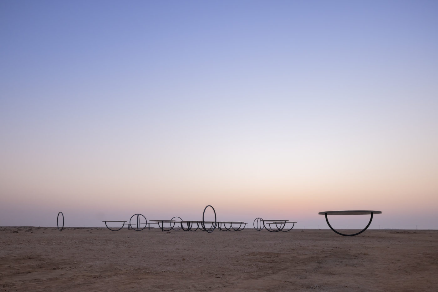 Elle comprend vingt abris circulaires en miroir, trois anneaux simples et deux anneaux doubles qui sont positionnés selon les axes d’un motif symétrique en quintuple. Les dix abris au centre forment un pentagramme ou une étoile à cinq branches. A noter que les principes sous-jacents à ces tels modèles de formes ont été récemment découverts par des mathématiciens occidentaux qui se sont penchés sur des conceptions sophistiquées trouvées dans les cultures islamiques à l’époque médiévale. L’oeuvre se présente comme une invitation à se r esynchroniser avec la planète. C’est également une célébration de tout ce qui se trouve et se déplace à travers le site désertique au nord de Doha au moment de visites : les animaux, les plantes et les êtres humains via de histoires, des traditions et des artefacts culturels faisant appel au vent, à la lumière du soleil et à l’air.