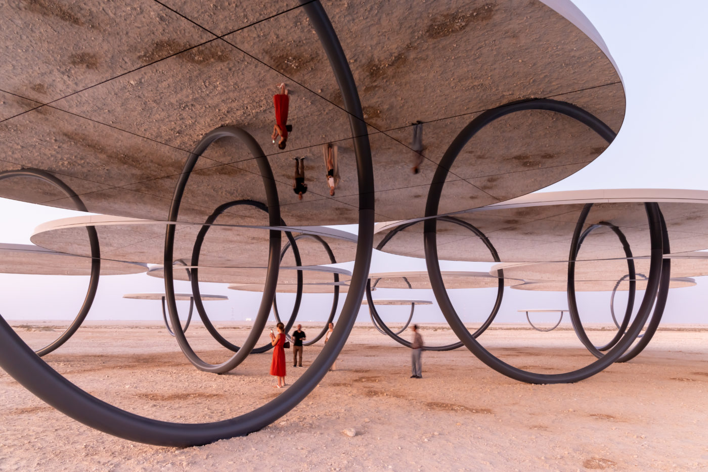Au contact de l’installation et en regardant du dessous en effet miroir, le sable enveloppe le visiteur, ainsi que toute autre personne partageant l’espace : « C’est une sorte de vérification de votre connexion au sol. Les miroirs connectent et perfectionnent ce qui est physiquement distinct et partiel, reliant l’environnement réel à l’espace réfléchi et créant une mer d’interconnexions. L’oscillation de votre regard, ainsi que le mouvement de votre corps, peuvent amplifier votre sentiment de présence, tandis que les structures courbes semblent se dématérialiser, devenant un paysage culturel naturel. » La seconde œuvre « Maqam I, Maqam II, Maqam III » (2021) de l’artiste libanaise Simone Fattal se présente, elle, ous la forme de trois sculptures monumentales qui semblent être des repères géographiques à travers une forme multiple pouvant être perçue comme une dune, une construction ou encore une tente.