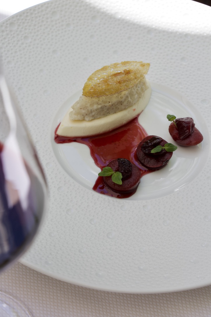 Le riz au lait, parfait glacé au saké, cerises confites au kirsch, figure sur le podium des desserts de l’été pour ses saveurs minutieuses : subtiles notes alcoolisées, discrète gousse de vanille et fraicheur acidulée de la cerise.