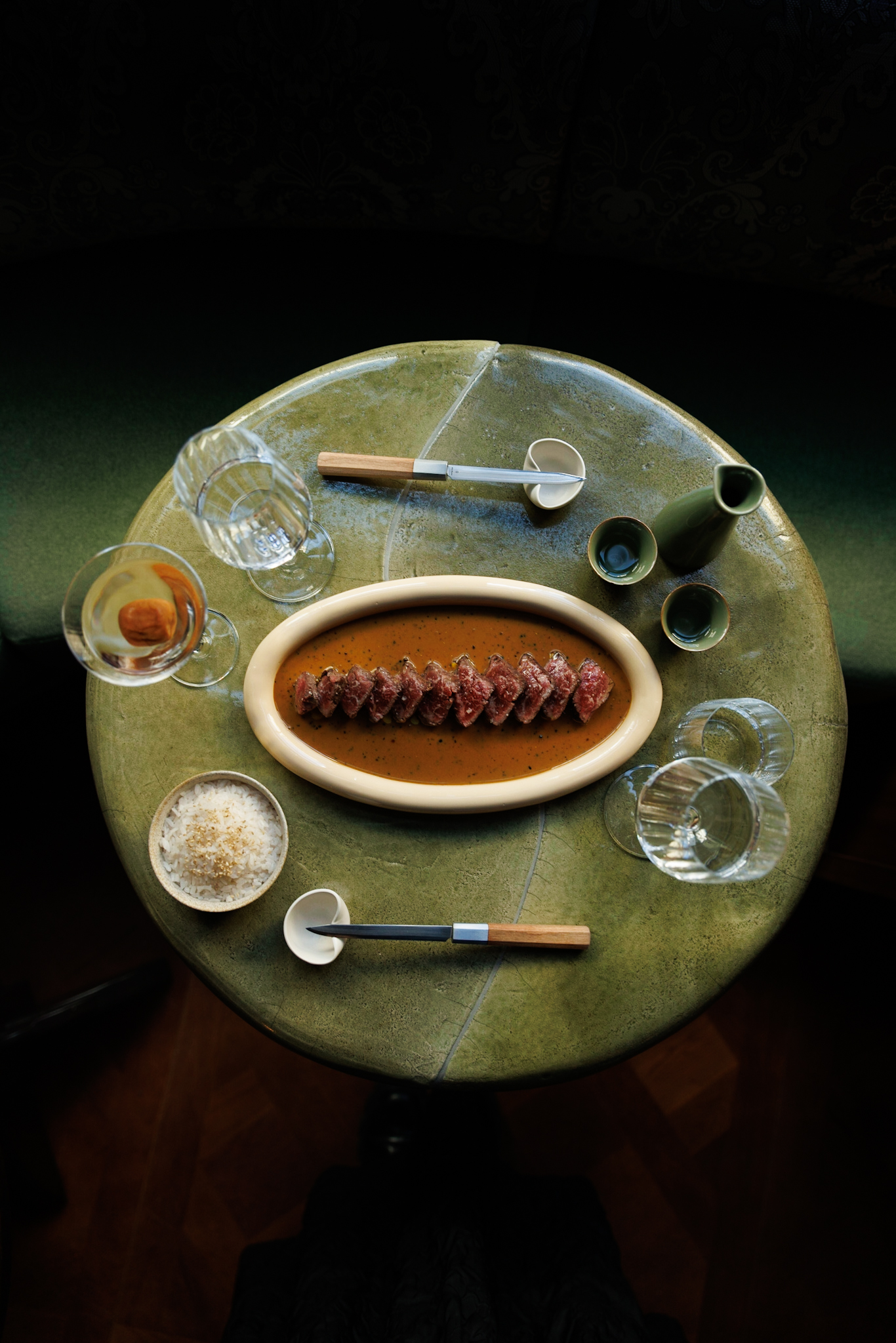Immergés dans cette capsule temporelle feutrée, se dérobant aux regards extérieurs, nous observons chaque détail aux notes « couture » et sensuelles, parfois complètement inconnues. Il y a, derrière chaque plat, tout un langage et une musicalité où la cérémonie et le rituel ne sont jamais loin. Trois plats tirent leur épingle du jeu. Ils dessineront un incroyable spectacle de saveurs et d’arômes. Tout d’abord sur le prometteur acte 1, qui nous conduit vers l’immanquable crudo de hamachi (26 euros). En bouche, la douceur est presque irréelle. On aime cette radicalité tranquille assumée et cette justesse où rien n’est superflu. A signaler que le Hanami d’asperges (21 euros) livre aussi une belle vérité brute. Le chef cuisine comme il respire en allant à l’essentiel et en prêtant l’oreille à la tradition tout en racontant une histoire sincère dans une grammaire faite de grands récits. Dans le verre ? On nous a suggéré le cocktail Akayane Martini qui donne une autre lecture du Dry Martini mais on lui préférera la surprenante cuvée One Way Ticket du Domaine du Haut Planty 2021. Un nectar hors des sentiers battus d’une grâce folle avec un coté bourguignon. Alain et Christian Couillaud réalisent une pure merveille avec ce vin de Loire-ovni élevé deux ans en fûts de chêne. Le nez issue du 100% Melon de Bourgogne se dirige vers la poire mûre, le bois tendre et les épices. Le service est juste comme il faut, impeccable. Dans la foulée, on s’oriente vers le sidérant Acte 2 avec, bien sûr, la fondante bavette Wagyu sauce au poivre de Sansho (56 euros).