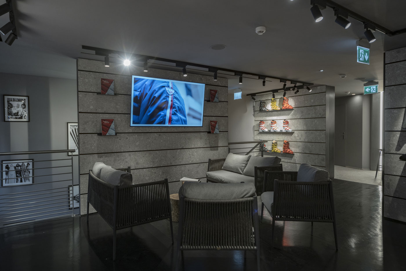 Inspirée par l’authenticité et l’audace de la marque alpine, la boutique et sa surface de 244m2 incube le style des collections Rossignol en proposant une expérience dynamique et diversifiée. On y retrouve l’ensemble des gammes ski et urbaines, le prêt à porter, les chaussures et accessoires, ainsi qu’une séléction « premium » de matériel dédié aux sports d’hiver. Alliant modernité et élégance tout en misant sur la technicité et le confort, Rossignol injecte son ADN au sein de son nouvel espace qui possède un esprit sportif et sophistiqué. Les éléments architecturaux, issus de matériaux traditionnels tels que le mélèze altéré, l’ardoise et le fer noir sont rehaussés par des volumes contemporains mis en lumière par un éclairage vif. Le salon et son bar fonctionnel, eux, confèrent à la boutique un espace chaleureux duquel les clients peuvent profiter à 360° sur deux niveaux.
