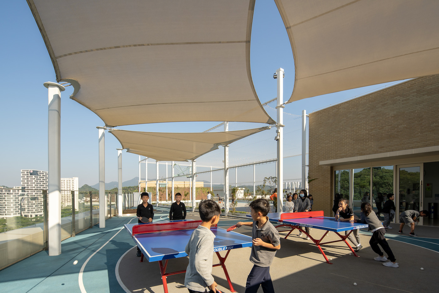 Un auvent de toit tendu protège les étudiants de la lumière intense du soleil à Shenzhen et crée une lumière tachetée en dessous. La structure respirante de la canopée et le mur vert le long du côté de l’aire de jeux sur le toit créent un environnement biophilique. L’intégration d’éléments naturels dans l’espace de mouvement est une décision de conception clé pour ce groupe d’âge – lorsque les enfants commencent à différencier le mouvement et la vie – et crée une appréciation de la nature et aide à développer l’empathie avec l’environnement naturel.