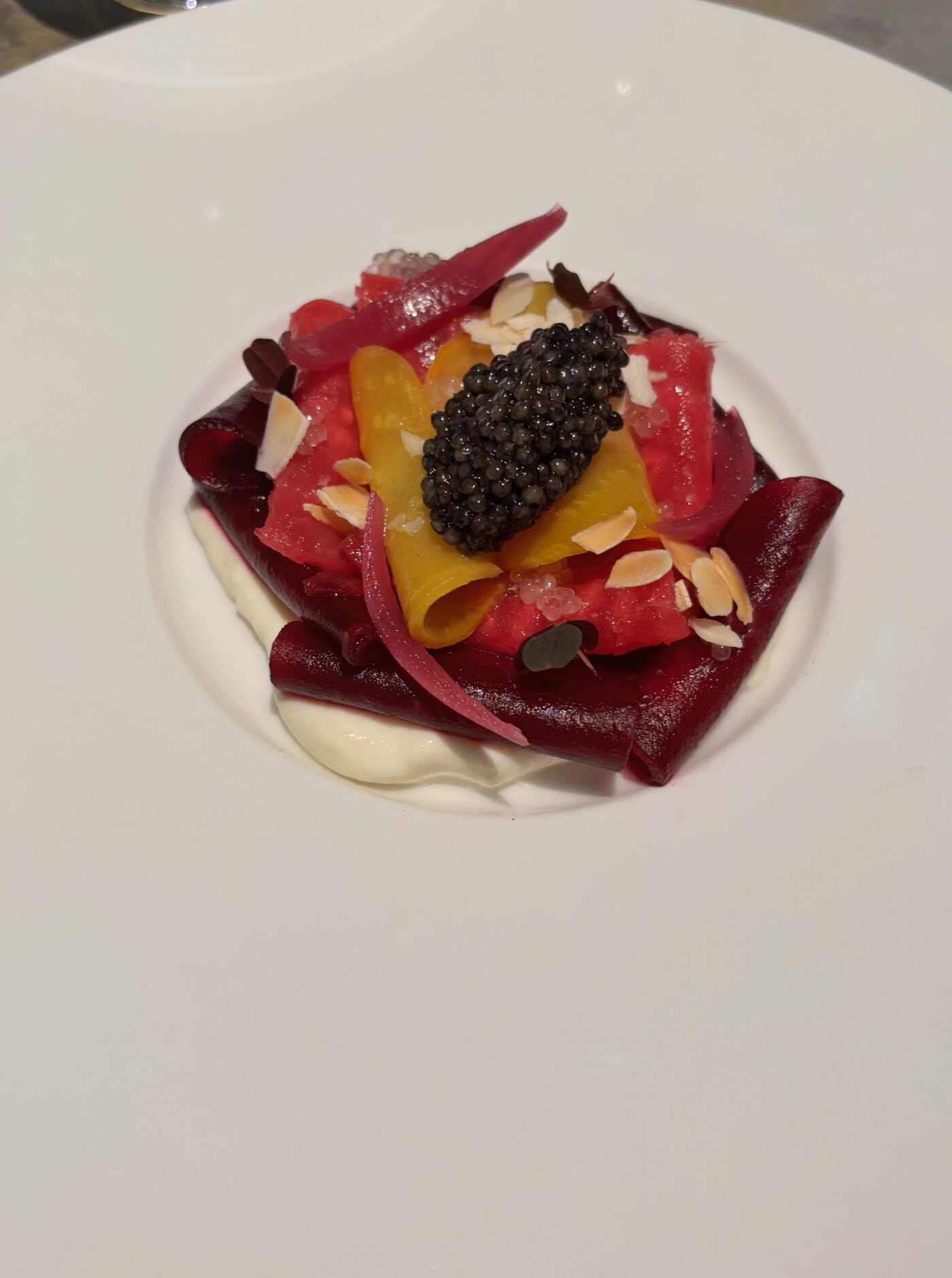 On attaque la déambulation gustative avec trois réjouissantes entrées en partage. Tout d’abord, le sublime carpaccio de betteraves avec sa crème de parmesan, citron caviar, oignons rouges de Tropea en aigre-doux et amandes effilées. Sur ce plat de soleil complexe et subtile, Etienne dépose une élégante quenelle de caviar Kasnodar de Madagascar telle une promesse de joie. Ensuite, les cannelloni farcis à la ricotta et aux épinards. Le chef témoigne ici sa tendresse pour son pays natal. Un vrai bonheur se profile aussitôt aux papilles. Le service, dans le sourire et l’écoute, assuré par le chef de rang Minto Raharjo est impeccable. Pour la troisième entrée, on est gâtés avec le réconfortant foie gras poêlé, oignons des Cévennes, pain brioché toasté, pickles de moutarde, chutney de pommes et jus de volaille. La gourmandise se fond dans un dressage de toute beauté. Dans le verre ? Un plaisant Chablis de chez Jean-Marc Brocard. On apprécie ce 100 % Chardonnay à la robe jaune pâle aux reflets verts argent élevé sur lies en cuve inox pendant 7-9 mois.