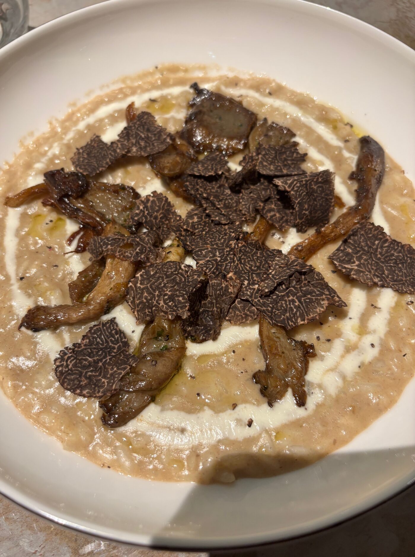 Le nez révèle des arômes fruités de pêche blanche. La bouche, elle, s’ouvre sur des notes de florales de fruits jaunes. Quand arrive l’instant des plats, on se laisse guider avec deux suggestions avisées de choix : le fameux Tagliolino du Piémont fait maison accompagné de sa bisque de langoustine tomatée, langoustine et huile de basilic. C’est alors que toute l’Italie se met à chanter sur un palais réjoui. Assurément notre coup de coeur absolu, le second plat du risotto aux champignons de saison et taleggio (fromage italien fabriqué à partir de lait de vache et originaire de Lombardie) enchante la tablée. Etienne fait les choses en grand en ajoutant 5 grammes de truffe de Molise venue du sud de la Botte entre les Abruzzes et les Pouilles, coté mer Adriatique. Un temps suspendu comme il est coutume de dire. Coté vin ? Le Château La Papeterie. Ce Montagne Saint-Emilion de caractère se distingue par sa vivacité et son expression aromatique. La bouche délivre des arômes fruités (pruneau) et se révèle ample, structurée par de fins tanins. Pour la petite histoire, ce vignoble d’un seul tenant, se situe le long de la Barbanne, petite rivière qui séparait autrefois la langue d’Oc de la langue d’Oy et où se trouvait un moulin de pâte à papier (qui a donné le nom de ce Château qui faisait alors partie du vignoble de Pomerol).
