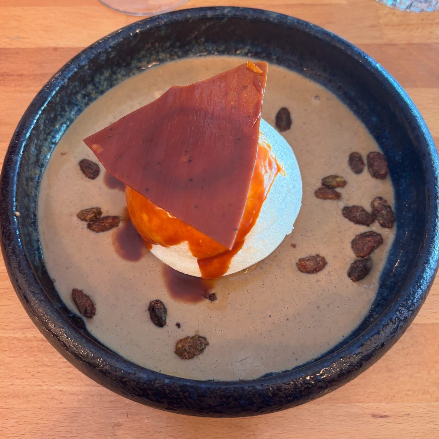 Quant au nez, riche et concentré, ce dernier offre un bouquet de fruits noirs (cassis), d’épices et agrémentées de nuances vanillées. Ce vin de la vallée de l’Hérault, au potentiel de garde énorme, est franc sur l’attaque en bouche, puis dévoile toute sa richesse et sa concentration. La matière est structurée avec des tanins serrés, mais à parfaite maturité. L’expression aromatique joue sur une palette de fruits noirs et d’épices. La finale, sur ce bouquet aromatique éclatant, est longue et puissante. A l’heure du dessert, nous tournons le dos à la culpabilité pour lui préférer l’abandon de soi autour des profiteroles glace noisette du Piémont, praliné et émulsion chaude au chocolat. Ajoutez à cette première merveille (soyons fous), l’île flottante, crème anglaise à la pistache, caramel au beurre salé, tuile caramel croquante, chouchous de pistache. C’est un peu comme si nous assistions, ébaubis, à l’ouverture des portes du paradis. Et pour consacrer au mieux cette plaisante apparition, nous tremperons nos lèvres dans le grisant porto Ramos Pinto, puis le vieux Pinault des Charentes de chez Lheraud avant d’entendre le chant singulier du Crillon des Vosges de Michel Lemoine. En quittant les lieux, on se dit que nous avons été reçus de manière princière et que, de la cave aux fourneaux, les hommes et les femmes, étaient au diapason comme animés d’une même passion. Il y a des jours comme ça qui se passeraient presque de tout commentaire. Tant la vie est belle !