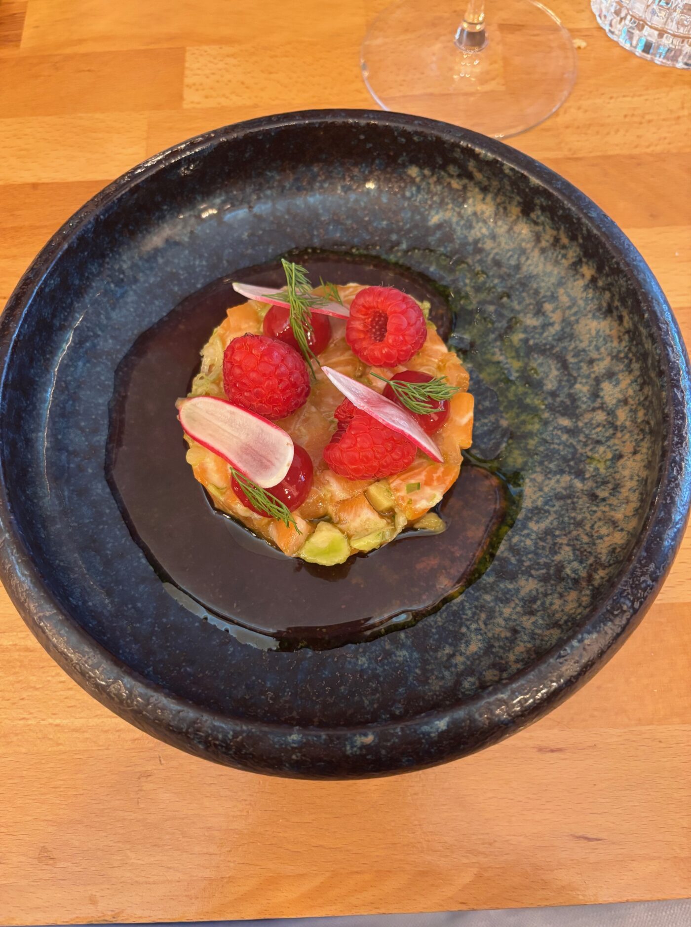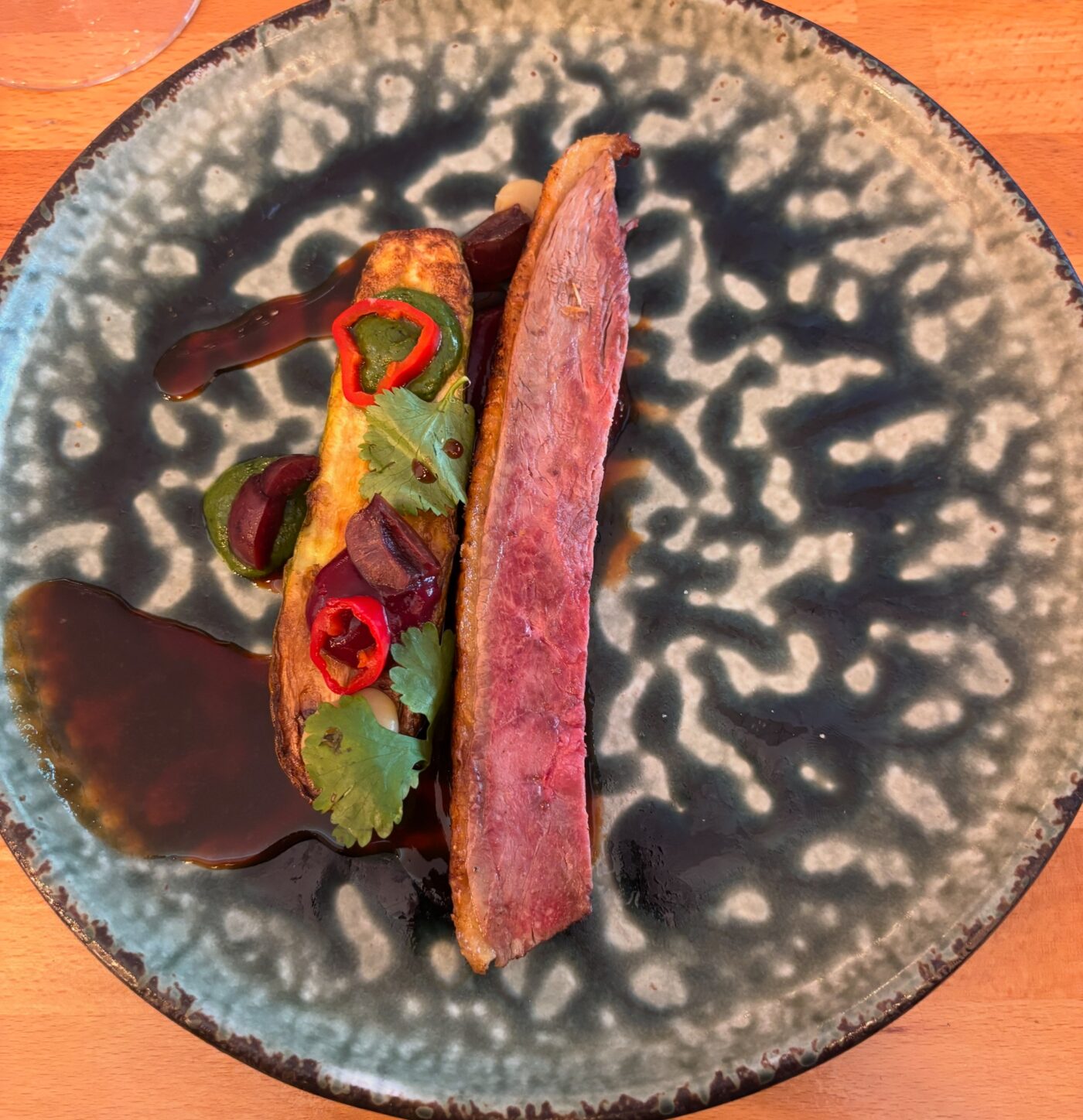 Ce magnifique millésime à la robe diaphane séduit d’emblée avec sa fraîcheur exceptionnelle qui s’élève du verre et cette sensation de pureté cristalline. Au nez, on a de petites fleurs blanches juste écloses, comme le tilleul. On perçoit aussi un parterre de violettes, encore mouillées de la rosée matinale. Sans oublier quelques éclats scintillants de roche calcaire. Au palais, on savoure cette empreinte minérale raffinée si typique de ces coteaux. Les herbes fines sont là également. Projetés sur un nuage de tendresse, nous revenons à notre dégustation dans l’assiette pour entendre désormais le récit du canard des Dombes rôti sur coffre, cuisse désossée et sauté au beurre maître d’hôtel. C’est un moment de grâce, qu’on se le dise, surtout avec ce remarquable jus de cerise qui se joint naturellement à la courgette grise juste snackée, condiment cerise, coriandre et citron. Pour le paring, on est condamnés à dégainer le meilleur (évidemment) et ce seront les divines Brunes du Domaine Les Creisses 2022. Cette grande cuvée est issue de Cabernet Sauvignon et de Syrah, plantés sur un terroir argilo-calcaire puis de Mourvèdre, situé sur une colline basaltique, exposée plein sud. Au regard, la robe est pourpre, soutenue, presque opaque, aux reflets violacés.