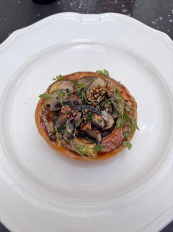 Ce dernier, brillant de mille feux, est le point névralgique des lieux. Au-dessus de ce grandiose plafond vitré ? Un ravissant hôtel 5 étoiles de 43 chambres et suites. A notre arrivée, le sympathique responsable F&B Léo Jourdeuil nous accueille chaleureusement et nous raconte brièvement l’ADN de cet restaurant « revampé » de 100 couverts (terrasse comprise) qui a accueilli, depuis son ouverture il y a un an, la faune très sélect de six fashion weeks, attirée par ce style festif et sexy savamment pensé s’inscrivant dans la longue histoire des grandes brasseries des années 50 à New York. Nous allons faire l’expérience de la formule de déjeuner à 34 euros pensée au millimètre par la talentueuse Mélanie Serre (grande voyageuse passée par l’Hôtel Eden Roc de St Barth, l’Atelier Joël Robuchon Etoile et qui est derrière l’Auberge du Bassin au Cap-Ferret). On attaque les festivités en douceur avec une coquette tarte fine aux champignons qui rayonne avec son savoureux jaune d’oeuf confit et sa réduction de vinaigre basalmique. C’est tout-à-fait convainquant et on se régale. Dans le verre ? Un superbe Meursault Les Meurgers 2023 du Domaine Mazilly servi en magnum. Ce détail fait toute le différence…