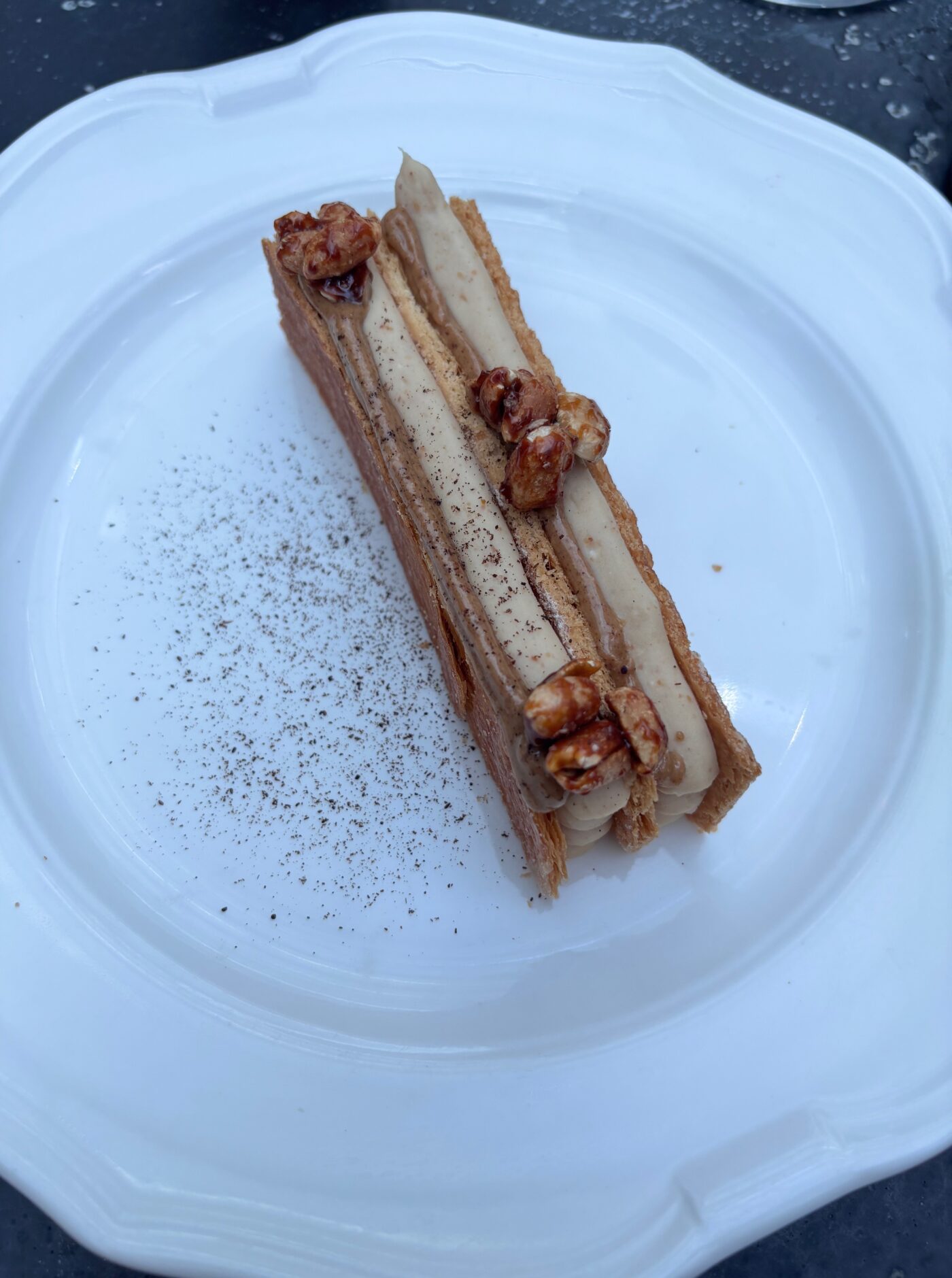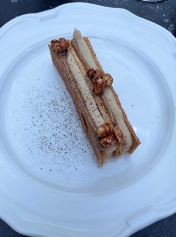 A l’instant du dessert, on suit la suggestion judicieuse du chef de rang Elouan consistant en un plaisir partagé, en tandem. Au centre de la table ? L’original et flamboyant citron vert faisant vibrer nos papilles de son crumble avoine, lime curd et sorbet au citron vert. C’est juste fou de tendresse et de fraîcheur. Dans un second temps, on se penche sur le redoutable mille-feuille qui, lui, nous bouleverse avec sa ganache à la cacahuète et ses cacahuètes caramélisées. On arrive à la conclusion ultime, dans ce décor transcendant (qui aurait beaucoup plu au grand Gatsby) que la pâtisserie est véritablement une science. En quittant les lieux, on se dit que la cheffe (accompagnée de Sho Ashizawa) marie l’assiette à une atmosphère dont le tempo fait virevolter les coeurs et que le service impeccable rend ici la dégustation chaque seconde plus stimulante. C’est vrai que ce lieu est surprenant et que les quatre copains (Olivier Bon, Pierre-Charles Cros, Xavier Padovani et Romée de Goriainoff) qui l’ont fait naître, savent flatter la rétine tout en répondant aux attentes des palais les plus exigeants. EDGAR recommande donc ce séduisant repaire à tous ses fidèles lecteurs !