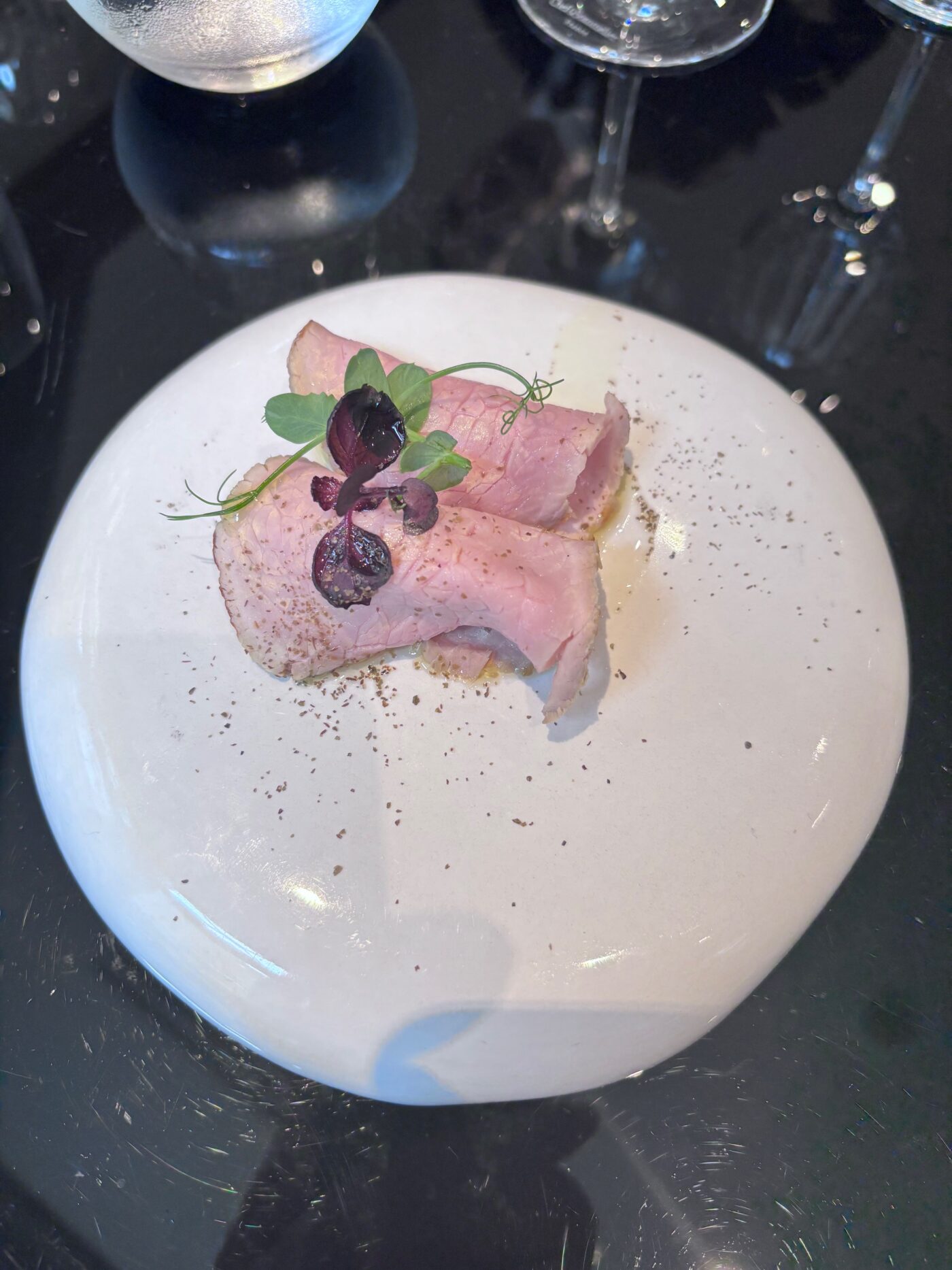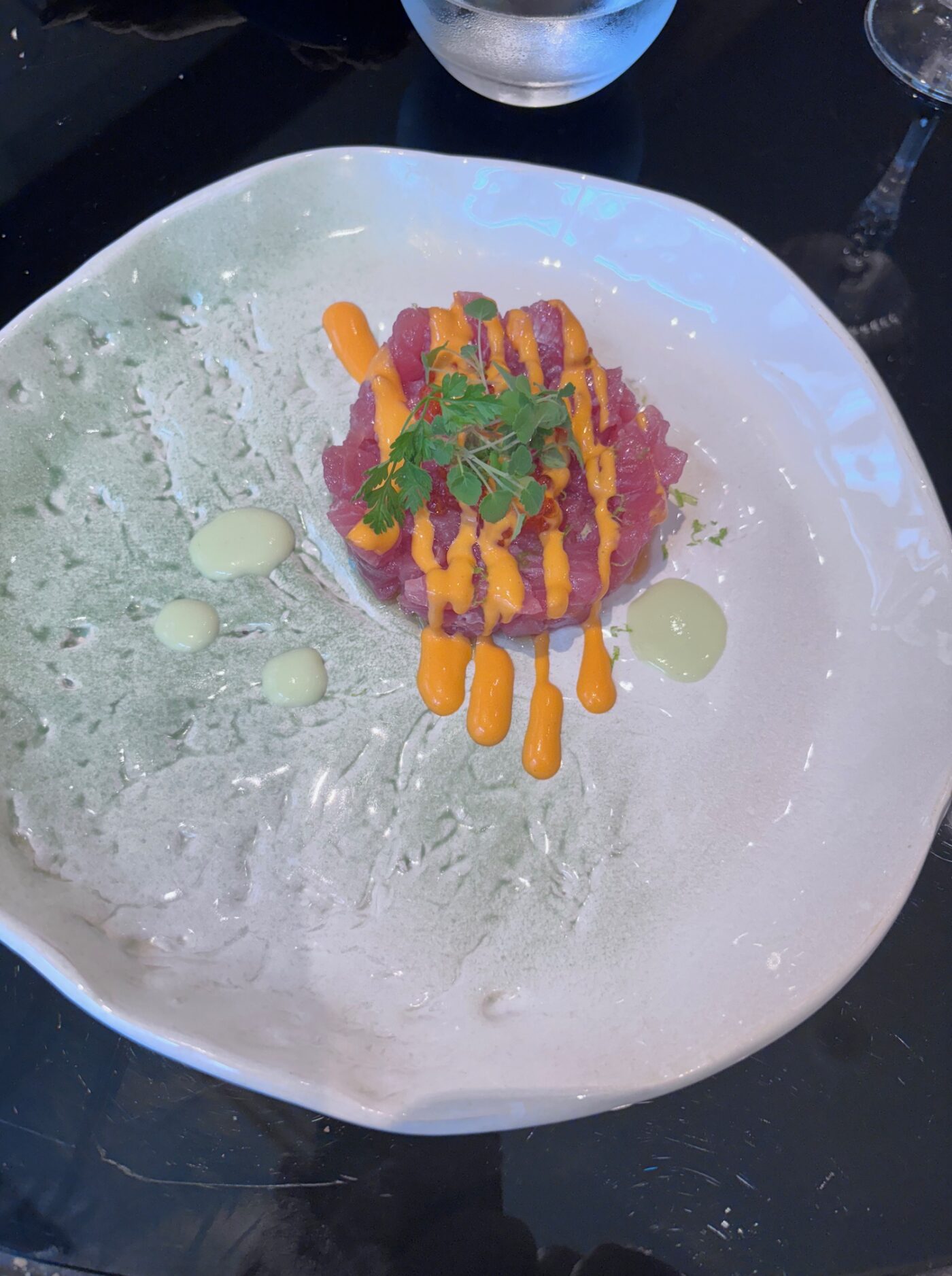 Blottie discrètement entre l’église polonaise Notre-Dame-de-l’Assomption et l’entrée du bar du Ritz, rue Cambon, cette adresse méconnue réserve à ses visiteurs et clients maintes surprises. Au sein de l’hôtel 5 étoiles Castille-Paris du groupe Starhotels Collezione, on vient d’abord admirer, dans la cour intérieure la superbe fresque d’époque représentant la conquête du Nouveau Monde par les Espagnols. Ensuite, il y a cette hospitalité transalpine se diffusant, comme dans un songe, du patio aux différents salons ouverts communicants, en cultivant ce charme d’antan du « comme à la maison ». A notre arrivée, nous sommes chaleureusement accueillis par l’élégante Alessandra Bragoli, Directrice Générale ainsi que par le brillant chef exécutif Sasha Arandjelovic qui nous propose de constituer, pour nous, un menu sur mesure en accords mets et vins. On se réjouit car on sait que nous verrons, à l’issue de cette expérience unique, le Piémont gastronomique avec un nouvel œil d’initié. On ouvre ainsi les festivités avec un magnifique tartare de thon rouge habillé par une sauce tomate porteuse des plus beaux parfums de l’été.