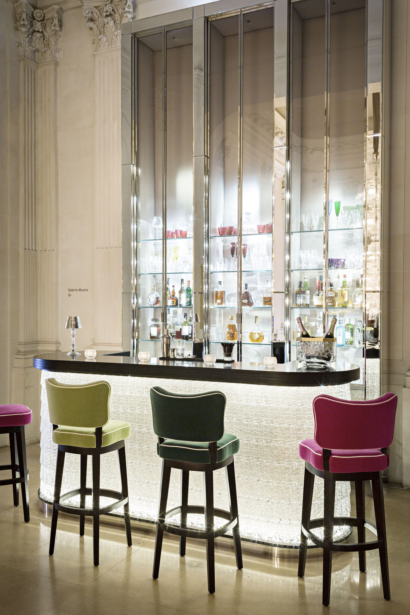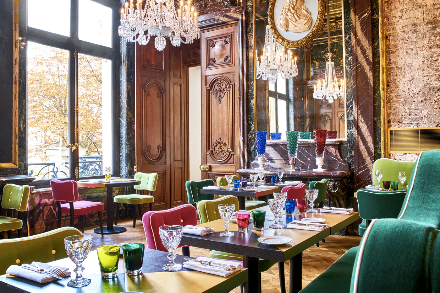 Jacques Grange s’est chargé de l’élaboration du nouveau décor en maintenant l’âme emblématique de l’hôtel particulier de Marie-Laure de Noailles en son coeur. Appréciez un cocktail signature dans le verre de votre choix au bar du premier étage avec vue sur le lustre au 157 lumières. Un mur arborant 576 tuiles de cristal confère au restaurant une illumination de l’espace grâce à ses multiples reflets. Les fauteuils, eux, s’étendent à travers de puissantes nuances de rose de vert et de rouge, par le biais d’un ravissant velours. Différents services de verres, Harcourt, Mille Nuits, Vega et Mosaique parent les tables, et le petit salon est sublimé par la lumière tamisée du lustre Sora, création de Eriko Horiki. La découverte continue du côté de la terrasse où huit convives pourront déjeuner dans un mood plus intimiste avec vue sur le square de la place des Etats-Unis.