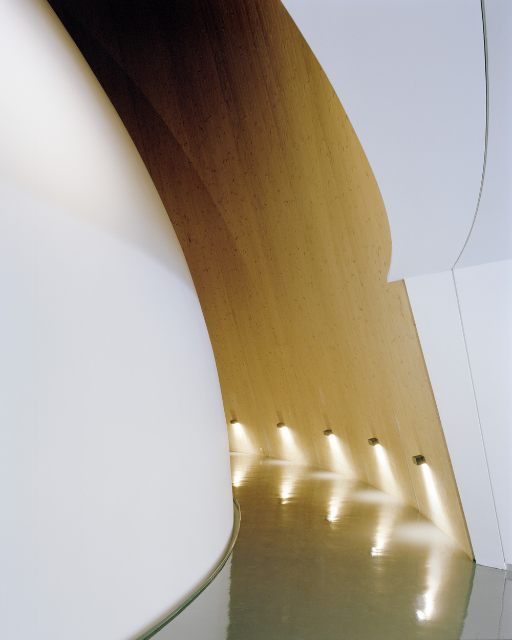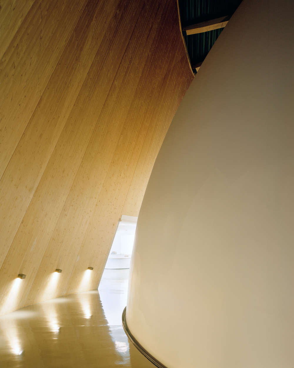 Glissée entre l’hémisphère et la face intérieure du cône, la galerie circulaire en pente légère offre une expérience spatiale pour passer de la clarté du hall à la pénombre indispensable au théâtre cosmique, où se fabriquent les cieux artificiels. Les panneaux de bois CLT de la structure mise à nu y atteignent 17 mètres et forment des facettes géantes : une démesure qui prépare au voyage dans l’espace. La rampe en pente douce conduit le spectateur en haut de la salle, sous le dôme de projection dont la suspension et l’inclinaison accusent l’effet d’immersion. L’éclairage, minimal, éclaire un environnement bleu nuit à haut coefficient d’absorption. Les six projecteurs numériques répartis au pourtour sont accessibles par la galerie technique qui entoure la salle.