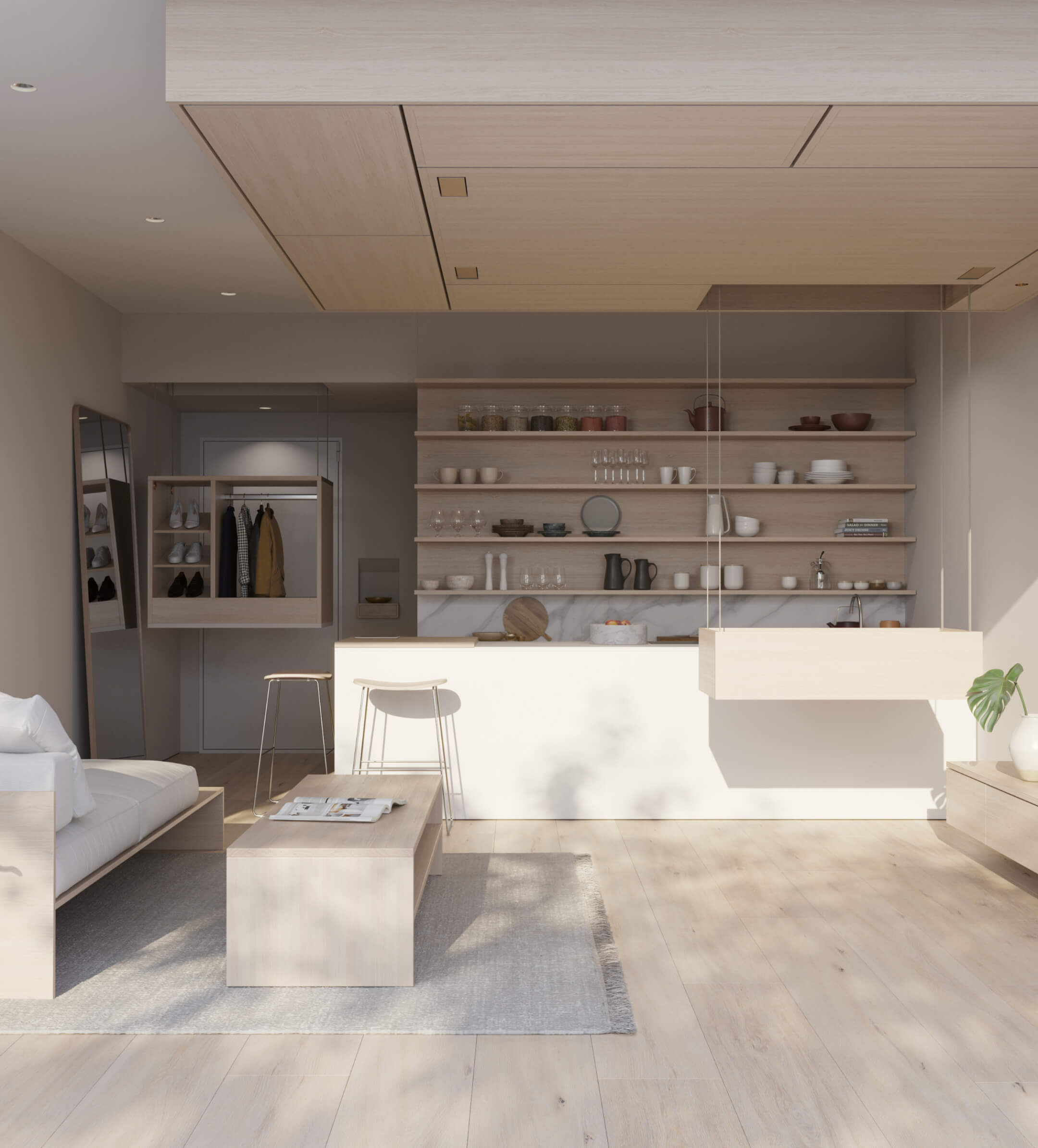 Construit sur une grille fabriqué en bois montée au plafond, le système peut contenir plusieurs tonnes et son interface est conçue pour cataloguer le contenu des unités de stockage afin que des objets particuliers puissent être invoqués via une application. L’espace peut ainsi se transformer de salon en bureau à domicile, en passant par la chambre selon les besoins d’une personne, continuant de changer au fil de la journée.