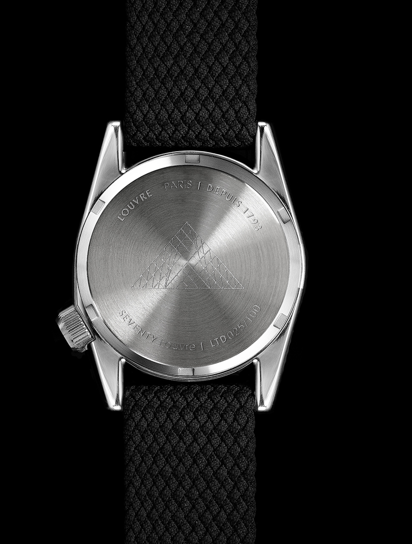 Comme un rappel au temps écoulé, le nom et la date de naissance du musée sont apposés sur un cadran soleillé or. L’incontournable Pyramide, ultime symbole de modernité, est gravée au dos de la montre. La dualité de l’icône est respectée : l’architecture de verre répond aux ors du Palais.