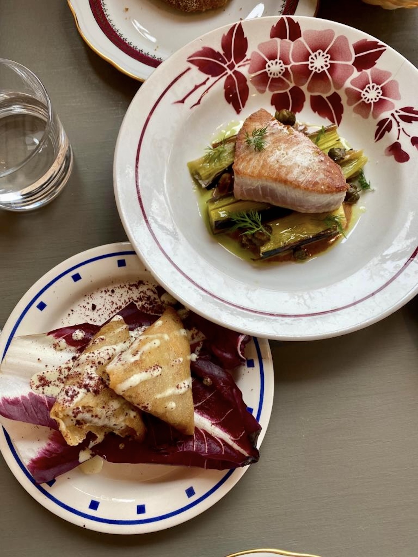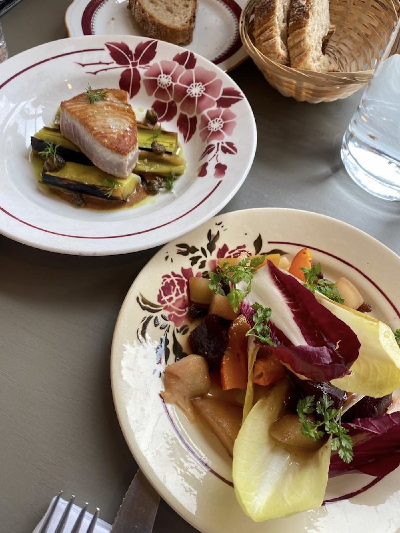 Les rayons du soleil, par jour de beau temps, s’invitent généreusement à notre table en pleine dégustation de plats à partager dont la composition varie selon les semaines. Ces dernières, éclatantes de mille couleurs – elles peuvent se le permettre, dans ce décor monochrome – sont servies dans de la porcelaine fleurie. Le contenu de ces assiettes nourrit nos yeux autant que nos papilles selon une volonté de proximité, de qualité et de singularité.